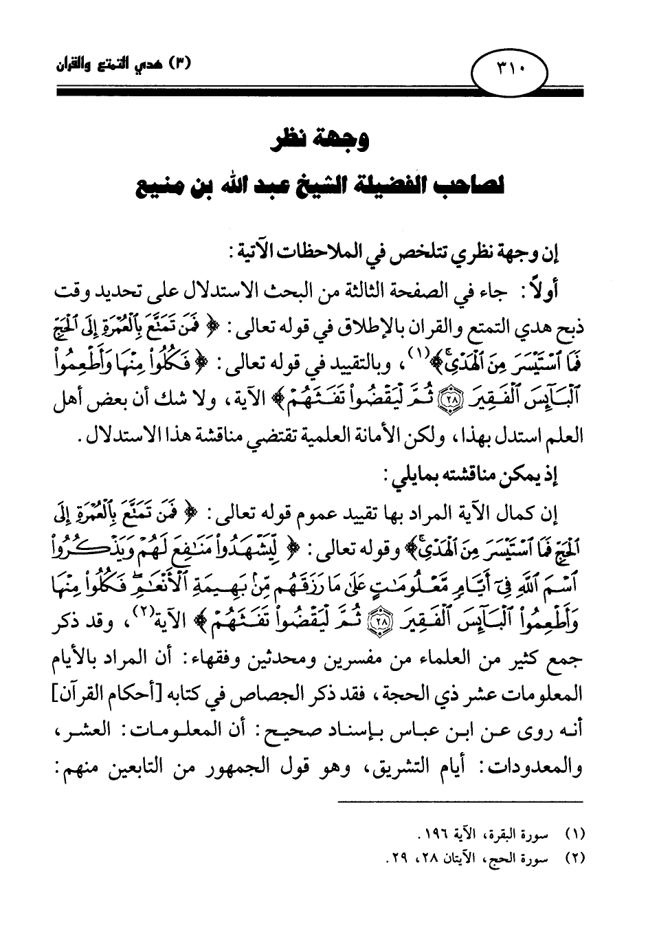 أولا: جاء في الصفحة الثالثة من البحث الاستدلال على تحديد وقت ذبح هدي التمتع والقران بالإطلاق في قوله تعالى: {فَمَنْ تَمَتَّعَ بِالْعُمْرَةِ إِلَى الْحَجِّ فَمَا اسْتَيْسَرَ مِنَ الْهَدْيِ} (¬1) وبالتقييد في قوله تعالى: {فَكُلُوا مِنْهَا وَأَطْعِمُوا الْبَائِسَ الْفَقِيرَ} (¬2) {ثُمَّ لْيَقْضُوا تَفَثَهُمْ} (¬3) الآية، ولا شك أن بعض أهل العلم استدل بهذا، ولكن الأمانة العلمية تقتضي مناقشة هذا الاستدلال.