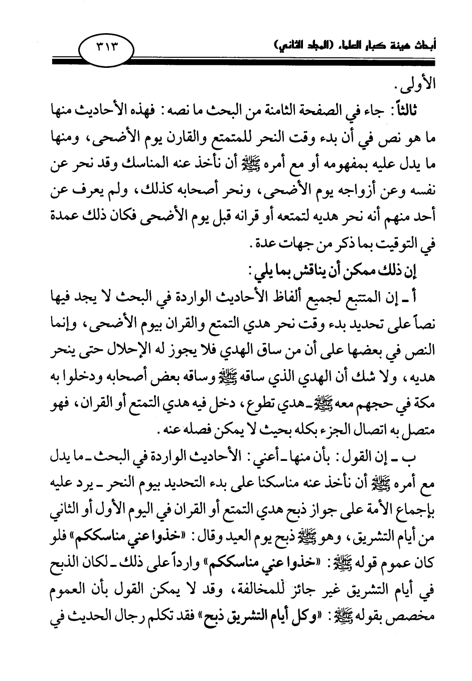 ثالثا: جاء في الصفحة الثامنة من البحث ما نصه: فهذه الأحاديث منها ما هو نص في أن بدء وقت النحر للمتمتع والقارن يوم الأضحى، ومنها ما يدل عليه بمفهومه أو مع أمره صلى الله عليه وسلم أن نأخذ عنه المناسك وقد نحر عن نفسه وعن أزواجه يوم الأضحى، ونحر أصحابه كذلك، ولم يعرف عن أحد منهم أنه نحر هديه لتمتعه أو قرانه قبل يوم الأضحى فكان ذلك عمدة في التوقيت بما ذكر من جهات عدة.