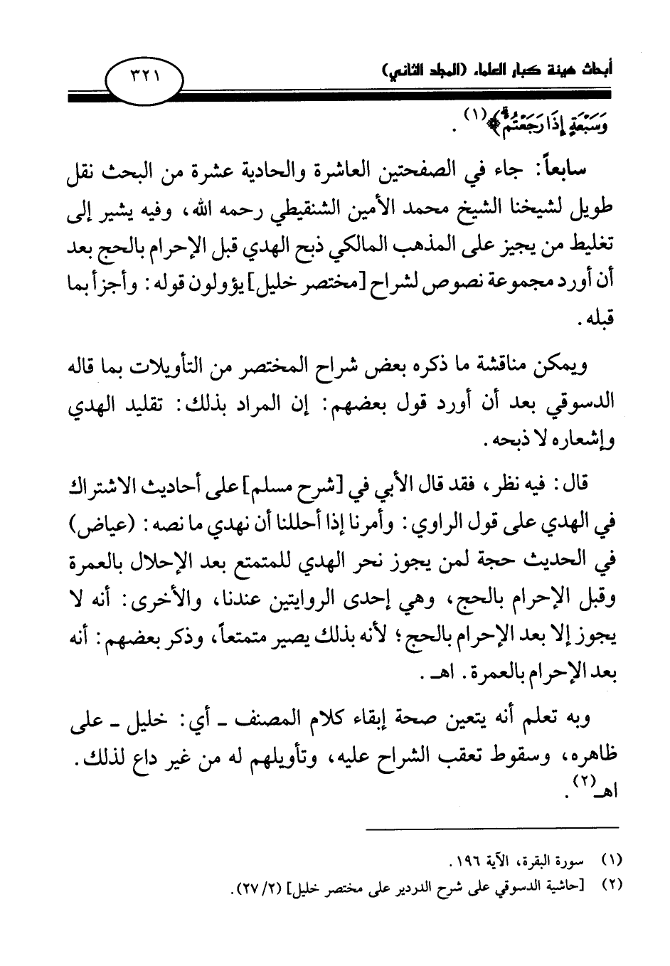 سابعا: جاء في الصفحتين العاشرة والحادية عشرة من البحث نقل طويل لشيخنا الشيخ محمد الأمين الشنقيطي - رحمه الله - وفيه يشير إلى تغليط من يجيز على المذهب المالكي ذبح الهدي قبل الإحرام بالحج بعد أن أورد مجموعة نصوص لشراح [مختصر خليل] يؤولون قوله: وأجزأ بما قبله.
