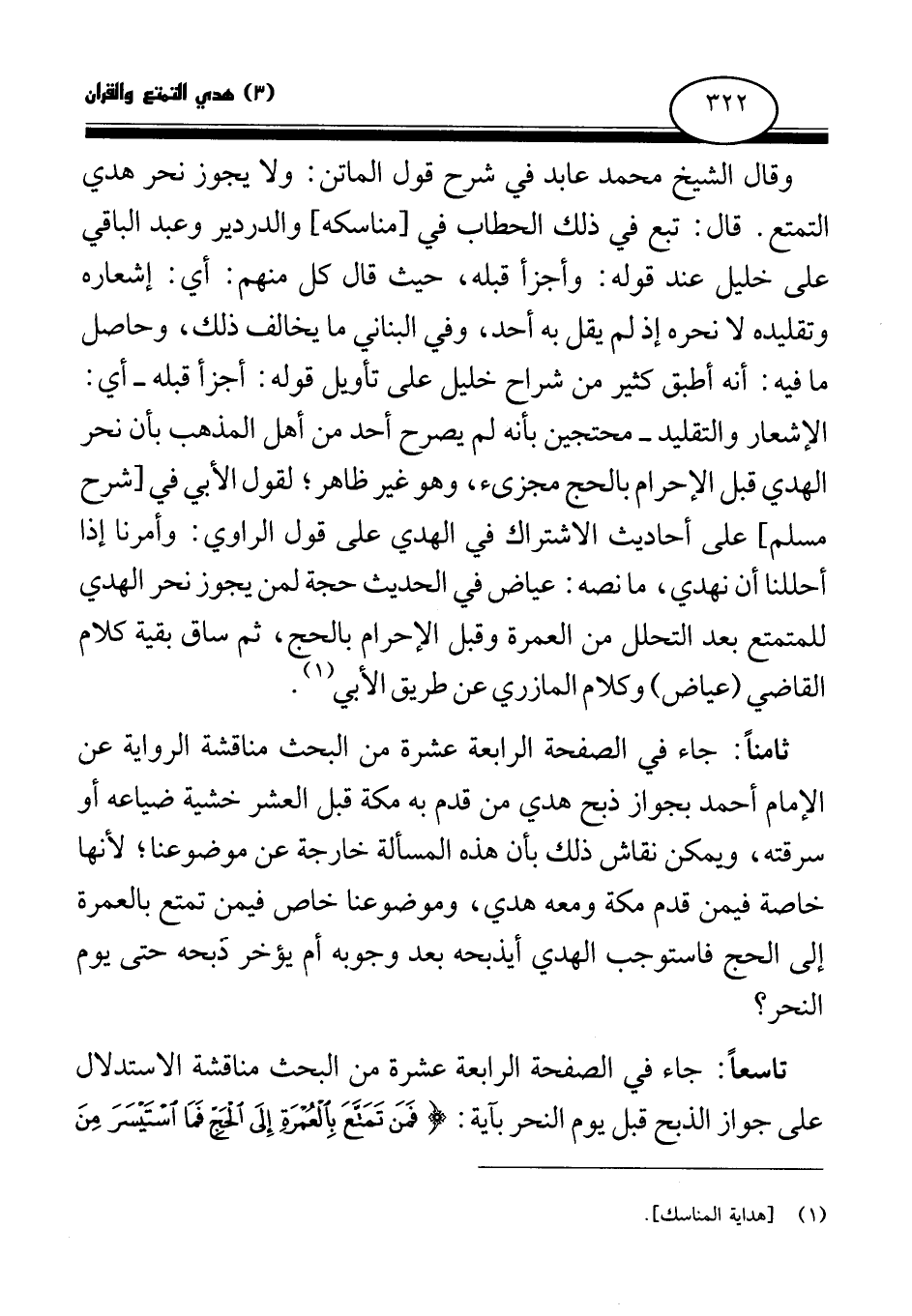 تاسعا: جاء في الصفحة الرابعة عشرة من البحث مناقشة الاستدلال على جواز الذبح قبل يوم النحر بآية: {فَمَنْ تَمَتَّعَ بِالْعُمْرَةِ إِلَى الْحَجِّ فَمَا اسْتَيْسَرَ مِنَ الْهَدْيِ} (¬2)