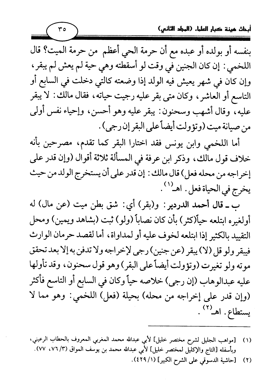 ب - قال أحمد الدردير: و (بقر) أي: شق بطن ميت (عن مال) له أو لغيره ابتلعه حيا (كثر) بأن كان نصابا (ولو) ثبت (بشاهد ويمين) ومحل التقييد بالكثير إذا ابتلعه لخوف عليه أو لمداواة، أما لقصد حرمان الوارث فيبقر ولو قل (لا) يبقر (عن جنين) رجي لإخراجه ولا تدفن به إلا بعد تحقق موته ولو تغيرت (وتؤولت أيضا على البقر) وهو قول سحنون، وقد تأولها عليه عبد الوهاب (إن رجي) خلاصه حيا وكان في السابع أو التاسع فأكثر (وإن - قدر على إخراجه من محله) بحيلة (فعل) اللخمي: وهو مما لا يستطاع. اهـ (¬1) .