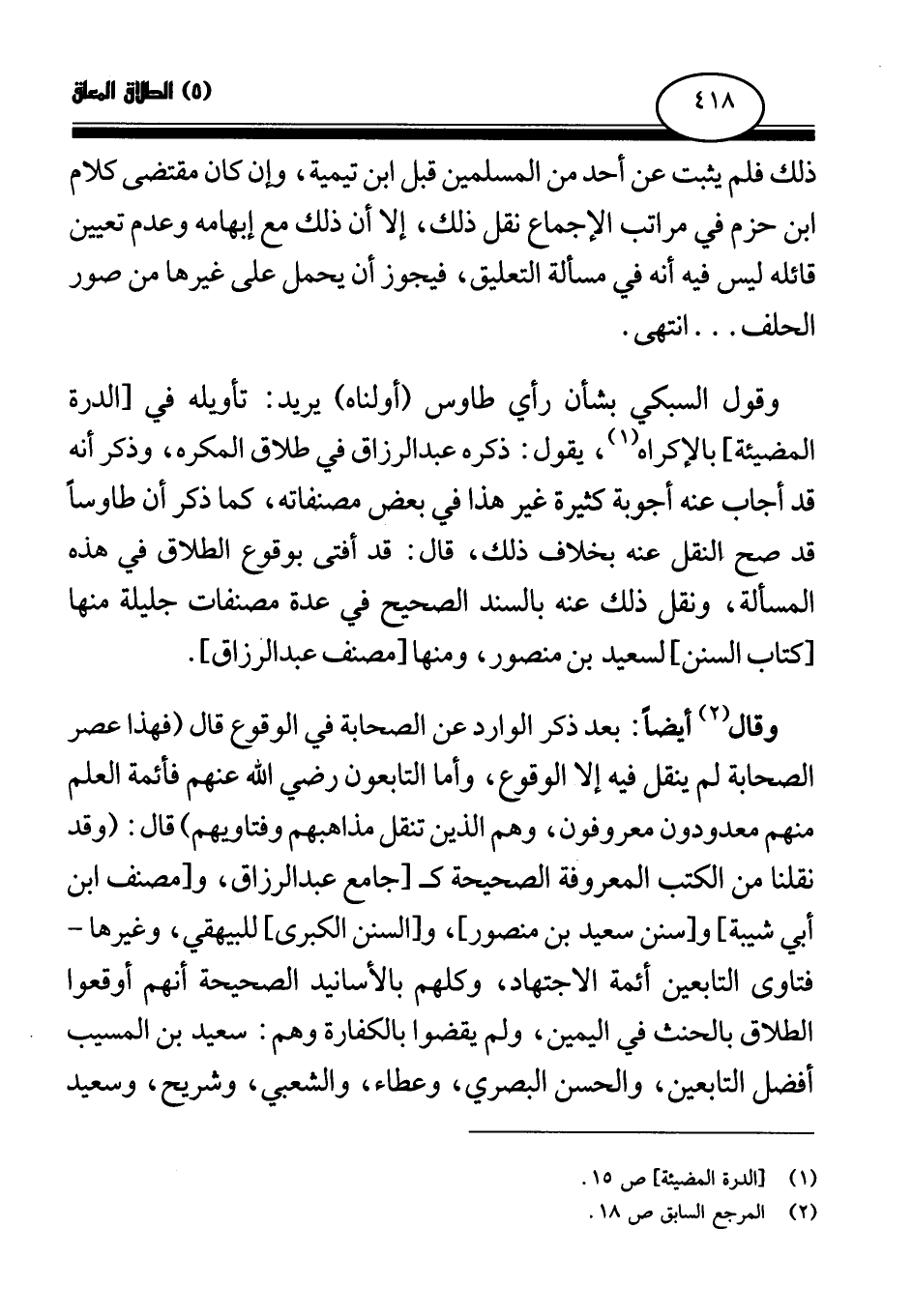 وقال (¬2) أيضا: بعد ذكر الوارد عن الصحابة في الوقوع قال: (فهذا عصر الصحابة لم ينقل فيه إلا الوقوع، وأما التابعون رضي الله عنهم فأئمة العلم منهم معدودون معروفون، وهم الذين تنقل مذاهبهم وفتاويهم) قال: (وقد نقلنا من الكتب المعروفة الصحيحة كـ[جامع عبد الرزاق] و [مصنف ابن أبي شيبة] و [سنن سعيد بن منصور] و [السنن الكبرى] للبيهقي، وغيرها- فتاوى التابعين أئمة الاجتهاد، وكلهم بالأسانيد الصحيحة أنهم أوقعوا الطلاق بالحنث في اليمين، ولم يقضوا بالكفارة وهم: سعيد بن المسيب أفضل التابعين، والحسن البصري، وعطاء، والشعبي، وشريح، وسعيد