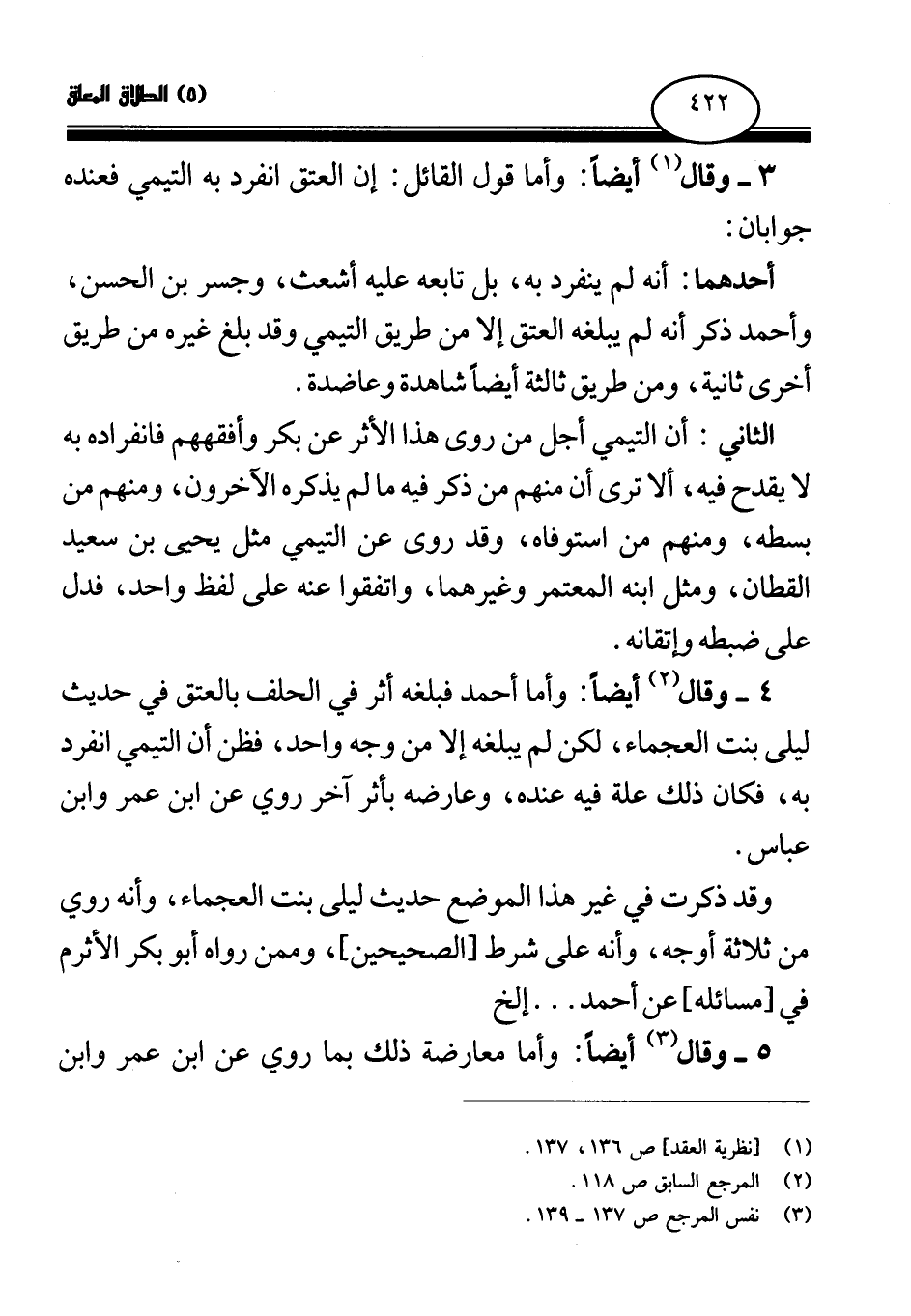 4 - وقال (¬2) أيضا: وأما أحمد فبلغه أثر في الحلف بالعتق في حديث ليلى بنت العجماء، لكن لم يبلغه إلا من وجه واحد، فظن أن التيمي انفرد به، فكان ذلك علة فيه عنده، وعارضه بأثر آخر روي عن ابن عمر وابن عباس.