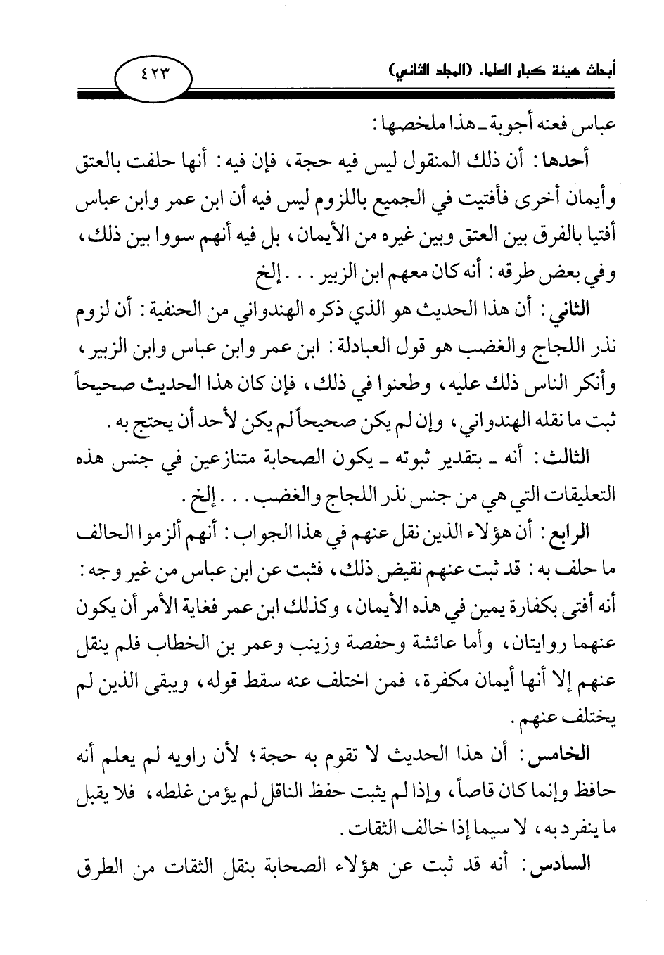 أحدها: أن ذلك المنقول ليس فيه حجة، فإن فيه: أنها حلفت بالعتق وأيمان أخرى فأفتيت في الجميع باللزوم ليس فيه أن ابن عمر وابن عباس أفتيا بالفرق بين العتق وبين غيره من الأيمان، بل فيه أنهم سووا بين ذلك، وفي بعض طرقه: أنه كان معهم ابن الزبير. . . إلخ.