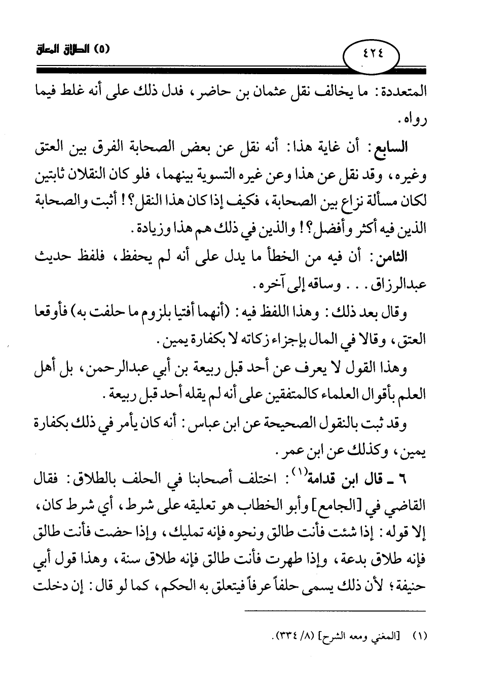 السابع: أن غاية هذا: أنه نقل عن بعض الصحابة الفرق بين العتق وغيره، وقد نقل عن هذا وعن غيره التسوية بينهما، فلو كان النقلان ثابتين لكان مسألة نزاع بين الصحابة، فكيف إذا كان هذا النقل؟ ! أثبت والصحابة الذين فيه أكثر وأفضل؟ ! والذين في ذلك هم هذا وزيادة.