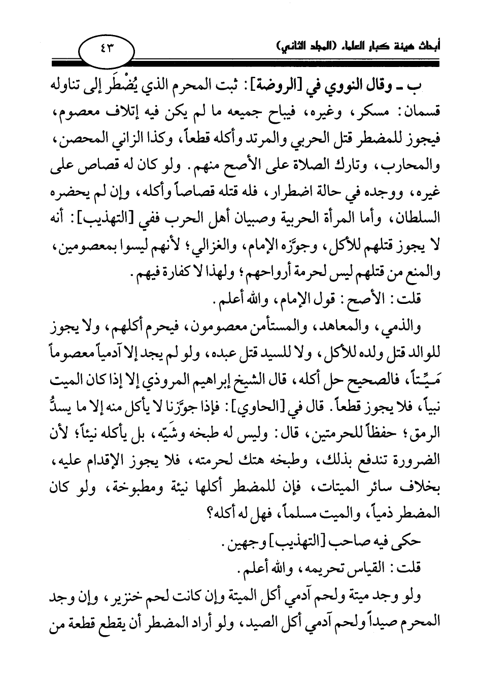 ب - وقال النووي في [الروضة] : ثبت المحرم الذي يضطر إلى تناوله قسمان: مسكر، وغيره، فيباح جميعه ما لم يكن فيه إتلاف معصوم، فيجوز للمضطر قتل الحربي والمرتد وأكله قطعا، وكذا الزاني المحصن، والمحارب، وتارك الصلاة على الأصح منهم. ولو كان له قصاص على غيره، ووجده في حالة اضطرار، فله قتله قصاصا وأكله، وإن لم يحضره السلطان، وأما المرأة الحربية وصبيان أهل الحرب ففي [التهذيب] : أنه لا يجوز قتلهم للأكل، وجوزه الإمام، والغزالي؛ لأنهم ليسوا بمعصومين، والمنع من قتلهم ليس لحرمة أرواحهم؛ ولهذا لا كفارة فيهم.