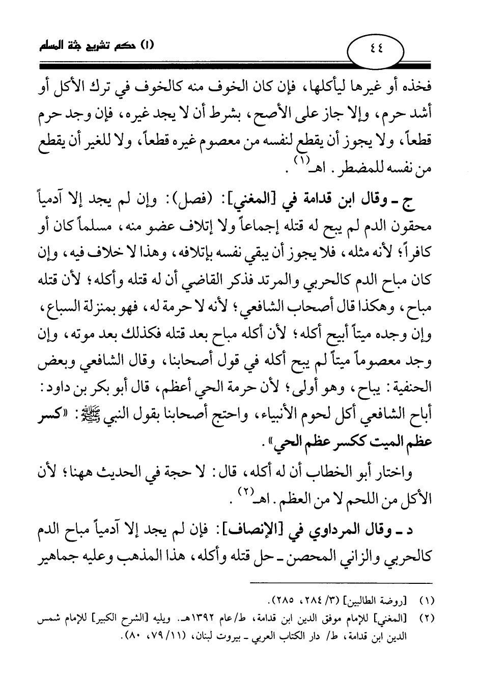 ج - وقال ابن قدامة في [المغني] : (فصل) : وإن لم يجد إلا آدميا محقون الدم لم يبح له قتله إجماعا ولا إتلاف عضو منه، مسلما كان أو كافرا؛ لأنه مثله، فلا يجوز أن يبقي نفسه بإتلافه، وهذا لا خلاف فيه، وإن كان مباح الدم كالحربي والمرتد فذكر القاضي أن له قتله وأكله؛ لأن قتله مباح، وهكذا قال أصحاب الشافعي؛ لأنه لا حرمة له، فهو بمنزلة السباع، وإن وجده ميتا أبيح أكله؛ لأن أكله مباح بعد قتله فكذلك بعد موته، وإن وجد معصوما ميتا لم يبح أكله في قول أصحابنا، وقال الشافعي وبعض الحنفية: يباح، وهو أولى؛ لأن حرمة الحي أعظم، قال أبو بكر بن داود: أباح الشافعي أكل لحوم الأنبياء، واحتج أصحابنا بقول النبي صلى الله عليه وسلم: «كسر عظم الميت ككسر عظم الحي (¬2) » .