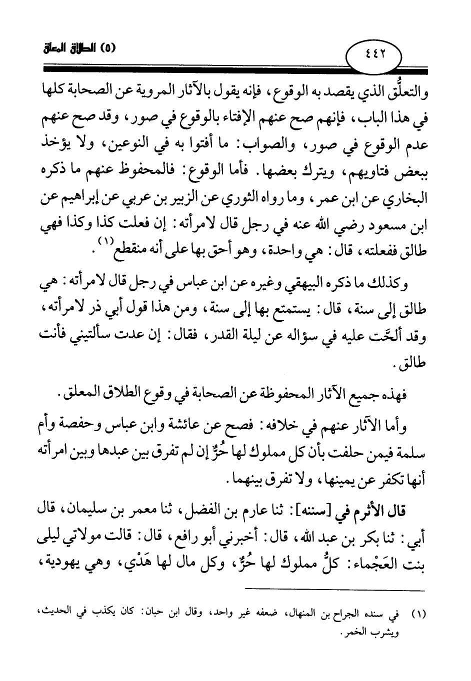 والتعلق الذي يقصد به الوقوع، فإنه يقول بالآثار المروية عن الصحابة كلها في هذا الباب، فإنهم صح عنهم الإفتاء بالوقوع في صور، وقد صح عنهم عدم الوقوع في صور، والصواب: ما أفتوا به في النوعين، ولا يؤخذ ببعض فتاويهم، ويترك بعضها. فأما الوقوع: فالمحفوظ عنهم ما ذكره البخاري عن ابن عمر، وما رواه الثوري عن الزبير بن عربي عن إبراهيم عن ابن مسعود رضي الله عنه في رجل قال لامرأته: إن فعلت كذا وكذا فهي طالق ففعلته، قال: هي واحدة، وهو أحق بها على أنه منقطع (¬1) .
