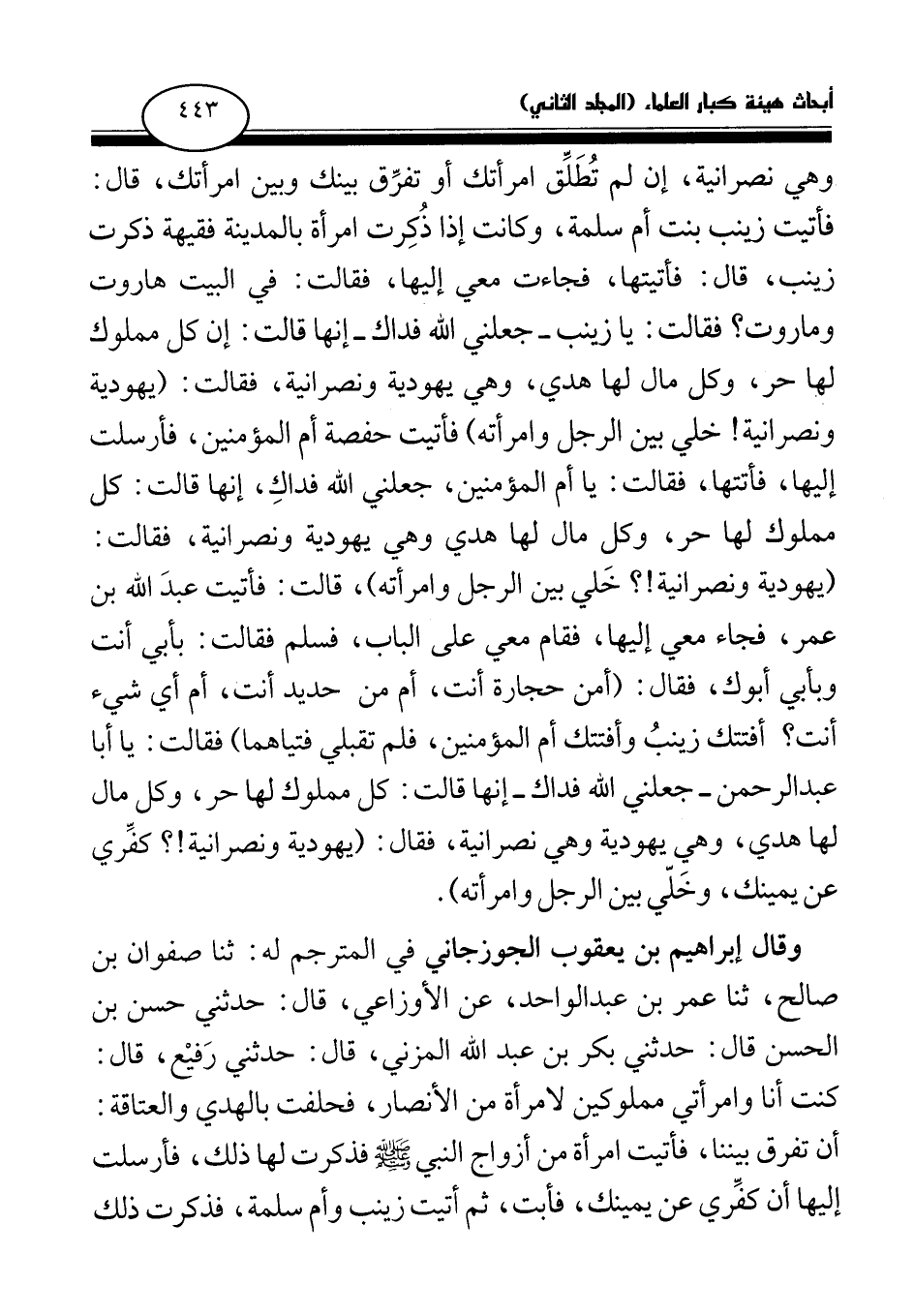 وهي نصرانية، إن لم تطلق امرأتك أو تفرق بينك وبين امرأتك، قال. فأتيت زينب بنت أم سلمة، وكانت إذا ذكرت امرأة بالمدينة فقيهة ذكرت زينب، قال: فأتيتها، فجاءت معي إليها، فقالت: في البيت هاروت وماروت؟ فقالت: يا زينب - جعلني الله فداك- إنها قالت: إن كل مملوك لها حر، وكل مال لها هدي، وهي يهودية ونصرانية، فقالت: (يهودية ونصرانية! خلي بين الرجل وامرأته) فأتيت حفصة أم المؤمنين، فأرسلت إليها، فأتتها، فقالت: يا أم المؤمنين، جعلني الله فداك، إنها قالت: كل مملوك لها حر، وكل مال لها هدي وهي يهودية ونصرانية! ؟ ، فقالت: (يهودية ونصرانية! ؟ خلي بين الرجل وامرأته) ، قالت: فأتيت عبد الله بن عمر، فجاء معي إليها، فقام معي على الباب، فسلم فقالت. بأبي أنت وبأبي أبوك، فقال: (أمن حجارة أنت، أم من حديد أنت، أم أي شيء أنت؟ أفتتك زينب وأفتتك أم المؤمنين، فلم تقبلي فتياهما) فقالت: يا أبا عبد الرحمن - جعلني الله فداك- إنها قالت: كل مملوك لها حر، وكل مال لها هدي، وهي يهودية وهي نصرانية، فقال. (يهودية ونصرانية! ؟ كفري عن يمينك، وخلي بين الرجل وامرأته) .