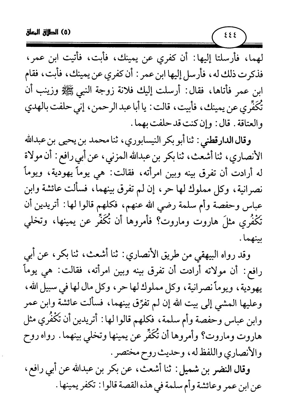 وقد رواه البيهقي من طريق الأنصاري: ثنا أشعث، ثنا بكر، عن أبي رافع: أن مولاته أرادت أن تفرق بينه وبين امرأته، فقالت: هي يوما يهودية، ويوما نصرانية، وكل مملوك لها حر، وكل مال لها في سبيل الله، وعليها المشي إلى بيت الله إن لم تفرق بينهما، فسألت عائشة وابن عمر وابن عباس وحفصة وأم سلمة، فكلهم قالوا لها: أتريدين أن تكفري مثل هاروت وماروت؟ وأمروها أن تكفر عن يمينها وتخلي بينهما. رواه روح والأنصاري واللفظ له، وحديث روح مختصر.