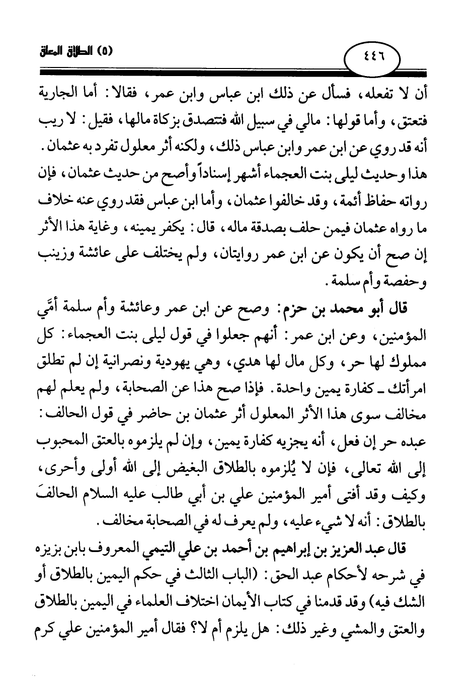قال عبد العزيز بن إبراهيم بن أحمد بن علي التيمي المعروف بابن بزيزه في شرحه لأحكام عبد الحق: (الباب الثالث في حكم اليمين بالطلاق أو الشك فيه) وقد قدمنا في كتاب الأيمان اختلاف العلماء في اليمين بالطلاق والعتق والمشي وغير ذلك: هل يلزم أم لا؟ فقال أمير المؤمنين علي كرم
