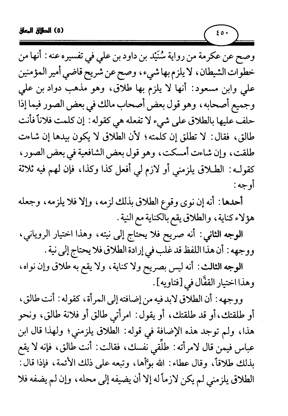 وصح عن عكرمة من رواية سنيد بن داود بن علي في تفسيره عنه: أنها من خطوات الشيطان، لا يلزم بها شيء، وصح عن شريح قاضي أمير المؤمنين علي وابن مسعود: أنها لا يلزم بها طلاق، وهو مذهب داود بن علي وجميع أصحابه، وهو قول بعض أصحاب مالك في بعض الصور فيما إذا حلف عليها بالطلاق على شيء لا تفعله هي كقوله: إن كلمت فلانا فأنت طالق، فقال: لا تطلق إن كلمته؛ لأن الطلاق لا يكون بيدها إن شاءت طلقت، وإن شاءت أمسكت، وهو قول بعض الشافعية في بعض الصور، كقوله: الطلاق يلزمني أو لازم لي أفعل كذا وكذا، فإن لهم فيه ثلاثة أوجه: