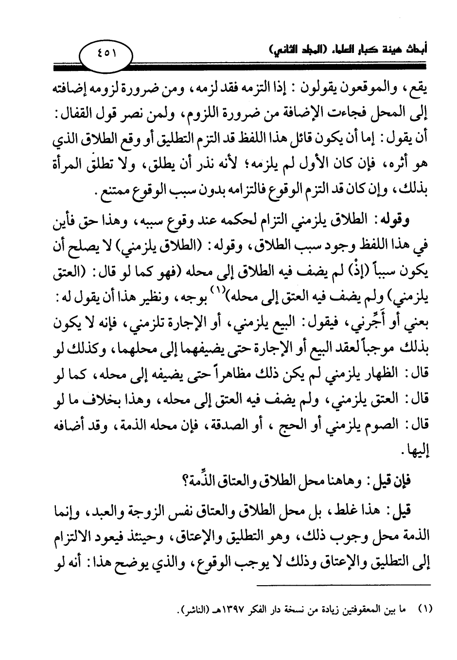 قيل: هذا غلط، بل محل الطلاق والعتاق نفس الزوجة والعبد، وإنما الذمة محل وجوب ذلك، وهو التطليق والإعتاق، وحينئذ فيعود الالتزام إلى التطليق والإعتاق وذلك لا يوجب الوقوع، والذي يوضح هذا: أنه لو