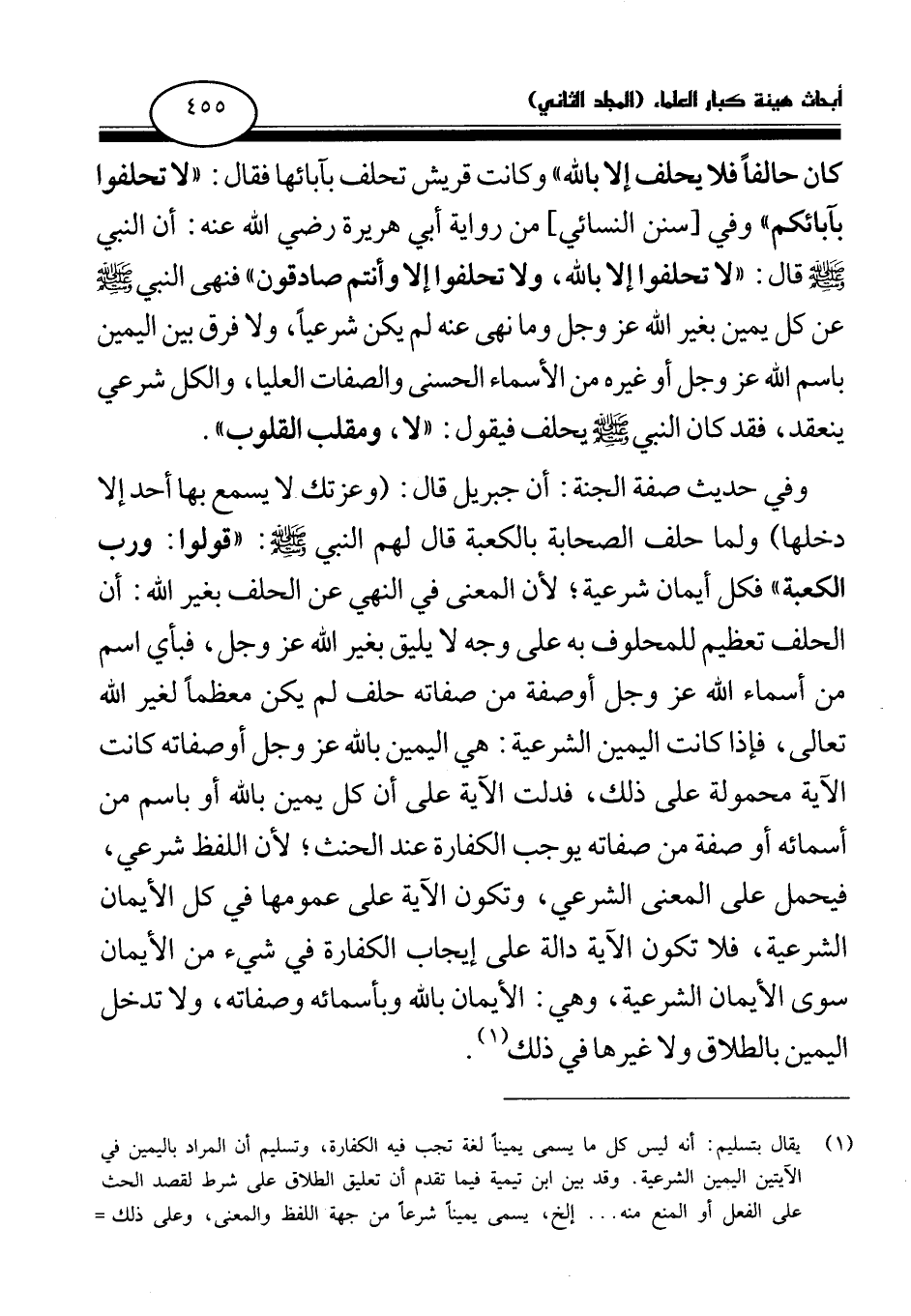 كان حالفا فلا يحلف إلا بالله (¬1) » وكانت قريش تحلف بآبائها فقال: «لا تحلفوا بآبائكم (¬2) » وفي [سنن النسائي] من رواية أبي هريرة رضي الله عنه: أن النبي صلى الله عليه وسلم قال: «لا تحلفوا إلا بالله، ولا تحلفوا إلا وأنتم صادقون (¬3) » فنهى النبي صلى الله عليه وسلم عن كل يمين بغير الله عز وجل وما نهى عنه لم يكن شرعيا، ولا فرق بين اليمين باسم الله عز وجل أو غيره من الأسماء الحسنى والصفات العليا، والكل شرعي ينعقد، فقد «كان النبي صلى الله عليه وسلم يحلف فيقول: "لا، ومقلب القلوب (¬4) » «وفي حديث صفة الجنة: أن جبريل قال: (وعزتك لا يسمع بها أحد إلا دخلها (¬5) » «ولما حلف الصحابة بالكعبة قال لهم النبي صلى الله عليه وسلم: "قولوا: ورب الكعبة (¬6) » فكل أيمان شرعية؛ لأن المعنى في النهي عن الحلف بغير الله: أن الحلف تعظيم للمحلوف به على وجه لا يليق بغير الله عز وجل، فبأي اسم من أسماء الله عز وجل أو صفة من صفاته حلف لم يكن معظما لغير الله تعالى، فإذا كانت اليمين الشرعية: هي اليمين بالله عز وجل أو صفاته كانت الآية محمولة على ذلك، فدلت الآية على أن كل يمين بالله أو باسم من أسمائه أو صفة من صفاته يوجب الكفارة عند الحنث؛ لأن اللفظ شرعي، فيحمل على المعنى الشرعي، وتكون الآية على عمومها في كل الأيمان الشرعية، فلا تكون الآية دالة على إيجاب الكفارة في شيء من الأيمان سوى الأيمان الشرعية، وهي: الأيمان بالله وبأسمائه وصفاته، ولا تدخل اليمين بالطلاق ولا غيرها في ذلك.