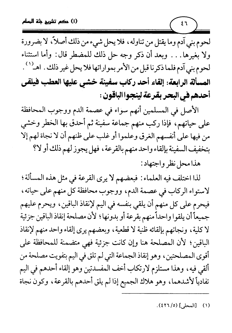 المسألة الرابعة: إلقاء أحد ركاب سفينة خشي عليها العطب فيلقى أحدهم في البحر بقرعة لينجو الباقون: