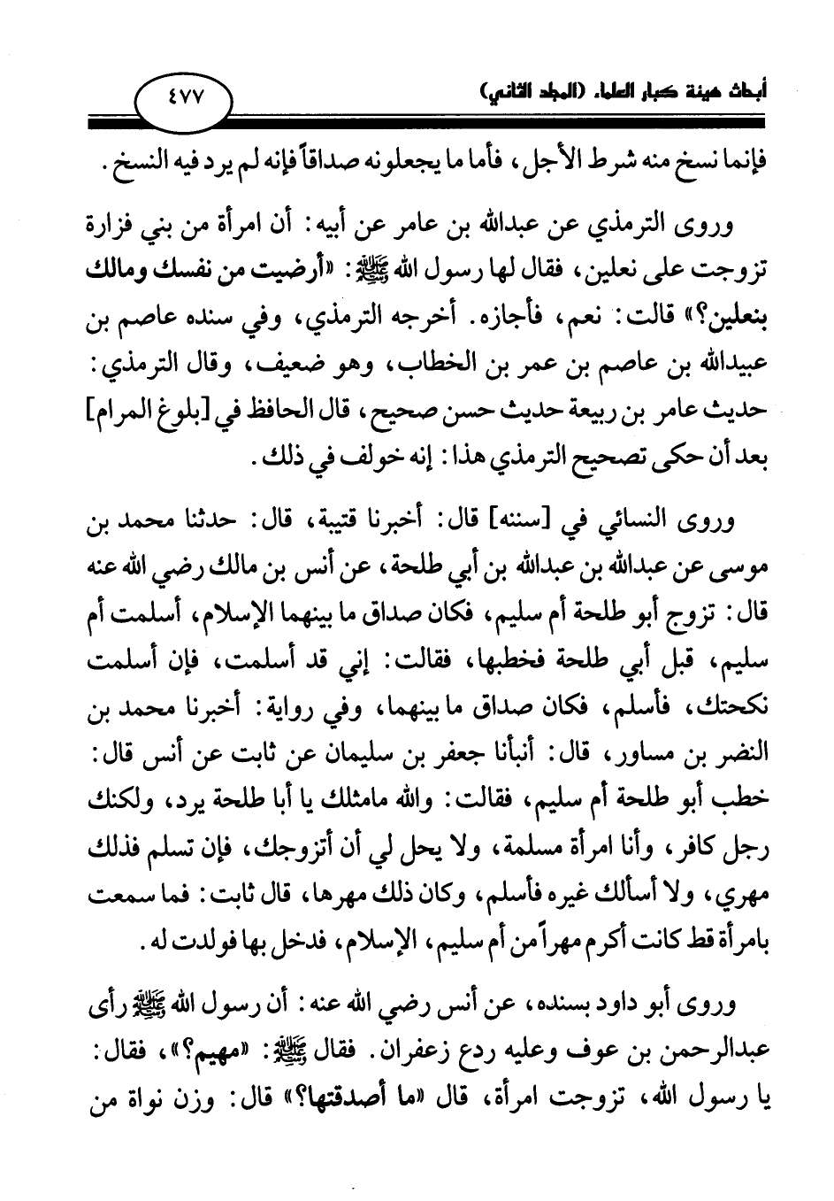 وروى الترمذي عن عبد الله بن عامر عن أبيه: «أن امرأة من بني فزارة تزوجت على نعلين، فقال لها رسول الله صلى الله عليه وسلم: "أرضيت من نفسك ومالك بنعلين؟ " قالت: نعم، فأجازه (¬1) » . أخرجه الترمذي، وفي سنده عاصم بن عبيد الله بن عاصم بن عمر بن الخطاب، وهو ضعيف، وقال الترمذي: حديث عامر بن ربيعة حديث حسن صحيح، قال الحافظ في [بلوغ المرام] بعد أن حكى تصحيح الترمذي هذا: إنه خولف في ذلك.