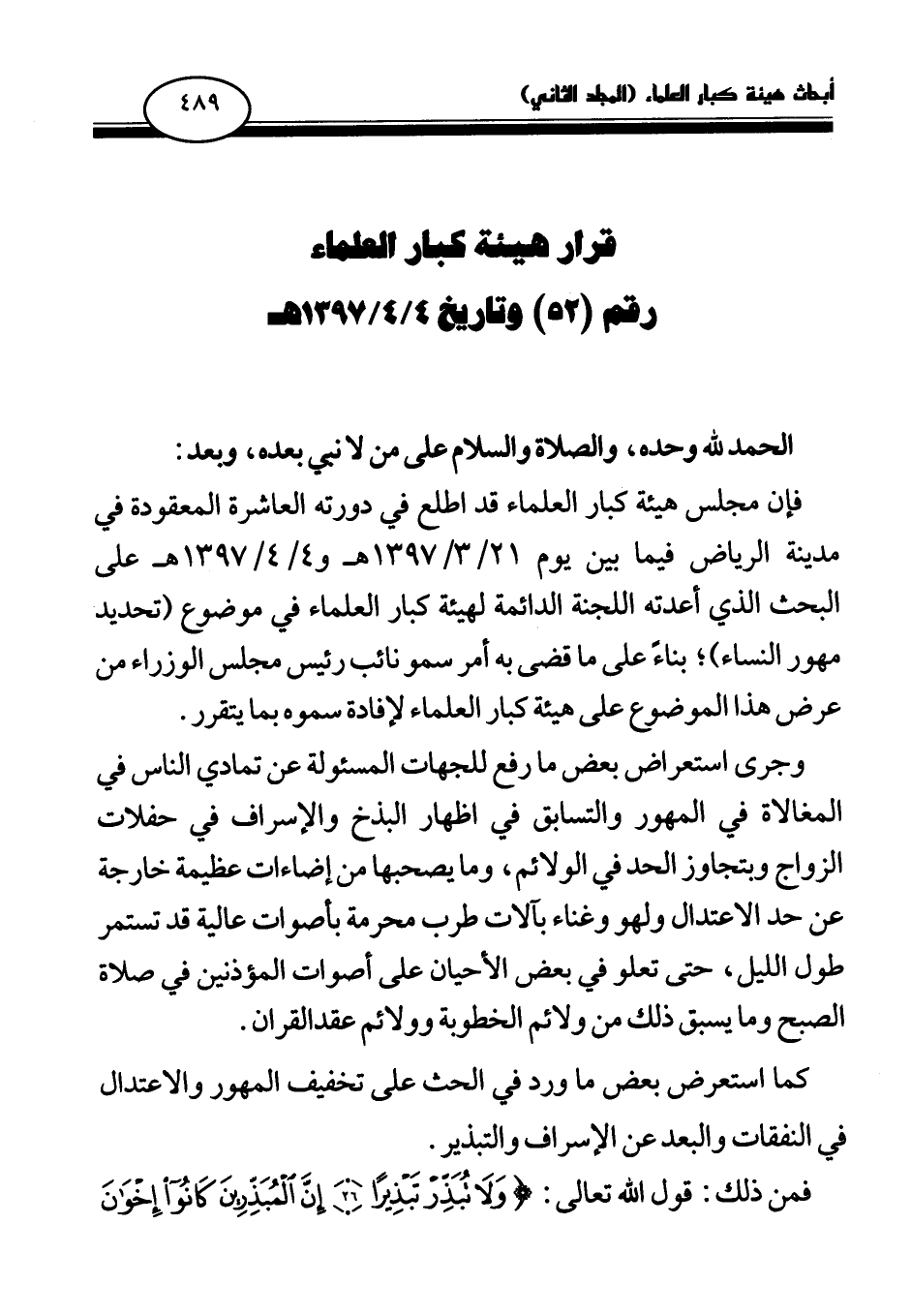فإن مجلس هيئة كبار العلماء قد اطلع في دورته العاشرة المعقودة في مدينة الرياض فيما بين يوم 21\3\1397 هـ و4\4\ 1397 هـ على البحث الذي أعدته اللجنة الدائمة لهيئة كبار العلماء في موضوع (تحديد مهور النساء) بناء على ما قضى به أمر سمو نائب رئيس مجلس الوزراء من عرض هذا الموضوع على هيئة كبار العلماء لإفادة سموه بما يتقرر.
