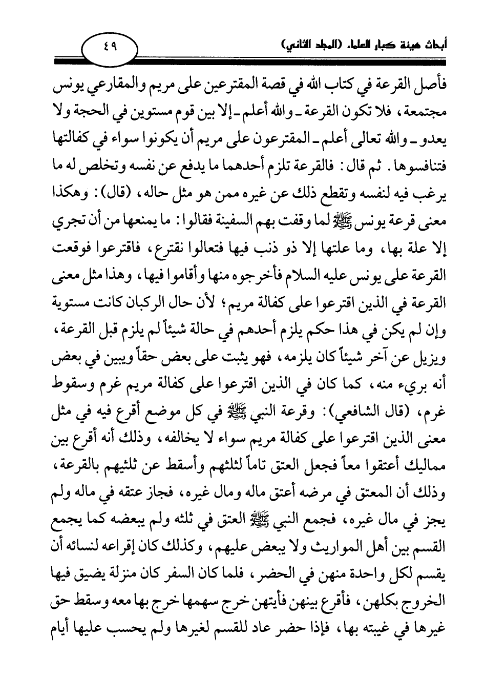 فأصل القرعة في كتاب الله في قصة المقترعين على مريم والمقارعي يونس مجتمعة، فلا تكون القرعة - والله أعلم - إلا بين قوم مستوين في الحجة ولا يعدو - والله تعالى أعلم - المقترعون على مريم أن يكونوا سواء في كفالتها فتنافسوها. ثم قال: فالقرعة تلزم أحدهما ما يدفع عن نفسه وتخلص له ما يرغب فيه لنفسه وتقطع ذلك عن غيره ممن هو مثل حاله، (قال) : وهكذا معنى قرعة يونس لما وقفت بهم السفينة فقالوا: ما يمنعها من أن تجري إلا علة بها، وما علتها إلا ذو ذنب فيها فتعالوا نقترع، فاقترعوا فوقعت القرعة على يونس عليه السلام فأخرجوه منها وأقاموا فيها، وهذا مثل معنى القرعة في الذين اقترعوا على كفالة مريم؛ لأن حال الركبان كانت مستوية وإن لم يكن في هذا حكم يلزم أحدهم في حالة شيئا لم يلزم قبل القرعة، ويزيل عن آخر شيئا كان يلزمه، فهو يثبت على بعض حقا ويبين في بعض أنه بريء منه، كما كان في الذين اقترعوا على كفالة مريم غرم وسقوط غرم، (قال الشافعي) : وقرعة النبي صلى الله عليه وسلم في كل موضع أقرع فيه في مثل معنى الذين اقترعوا على كفالة مريم سواء لا يخالفه، وذلك أنه أقرع بين مماليك أعتقوا معا فجعل العتق تاما لثلثهم وأسقط عن ثلثيهم بالقرعة، وذلك أن المعتق في مرضه أعتق ماله ومال غيره، فجاز عتقه في ماله ولم يجز في مال غيره، فجمع النبي صلى الله عليه وسلم العتق في ثلثه ولم يبعضه كما يجمع القسم بين أهل المواريث ولا يبعض عليهم، وكذلك كان إقراعه لنسائه أن يقسم لكل واحدة منهن في الحضر، فلما كان السفر كان منزلة يضيق فيها الخروج بكلهن، فأقرع بينهن فأيتهن خرج سهمها خرج بها معه وسقط حق غيرها في غيبته بها، فإذا حضر عاد للقسم لغيرها ولم يحسب عليها أيام