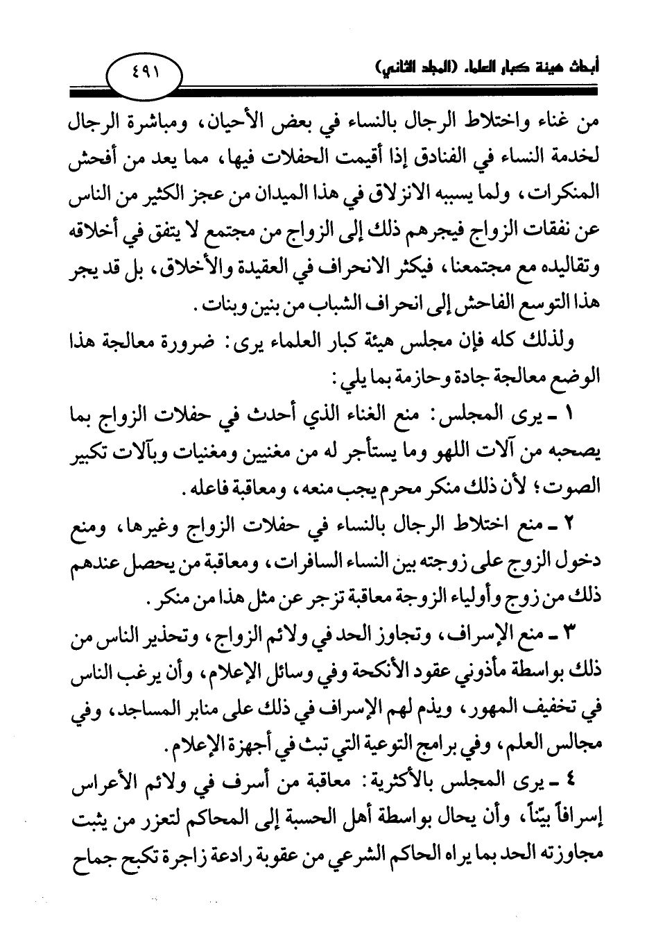 4 - يرى المجلس بالأكثرية: معاقبة من أسرف في ولائم الأعراس إسرافا بينا، وأن يحال بواسطة أهل الحسبة إلى المحاكم لتعزر من يثبت مجاوزته الحد بما يراه الحاكم الشرعي من عقوبة رادعة زاجرة تكبح جماح