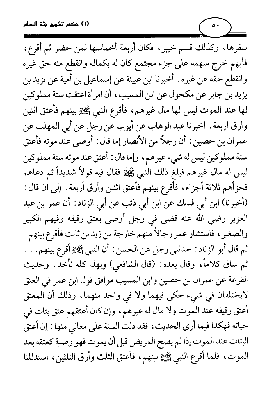 سفرها، وكذلك قسم خيبر، فكان أربعة أخماسها لمن حضر ثم أقرع، فأيهم خرج سهمه على جزء مجتمع كان له بكماله وانقطع منه حق غيره وانقطع حقه عن غيره. أخبرنا ابن عيينة عن إسماعيل بن أمية عن يزيد بن يزيد بن جابر عن مكحول عن ابن المسيب، «أن امرأة أعتقت ستة مملوكين لها عند الموت ليس لها مال غيرهم، فأقرع النبي صلى الله عليه وسلم بينهم فأعتق اثنين وأرق أربعة (¬1) » . أخبرنا عبد الوهاب عن أيوب عن رجل عن أبي المهلب عن عمران بن حصين: «أن رجلا من الأنصار إما قال: أوصى عند موته فأعتق ستة مملوكين ليس له شيء غيرهم، وإما قال: أعتق عند موته ستة مملوكين ليس له مال غيرهم فبلغ ذلك النبي صلى الله عليه وسلم فقال فيه قولا شديدا ثم دعاهم فجزأهم ثلاثة أجزاء، فأقرع بينهم فأعتق اثنين وأرق أربعة (¬2) » . إلى أن قال: (أخبرنا) ابن أبي فديك عن ابن أبي ذئب عن أبي الزناد: أن عمر بن عبد العزيز رضي الله عنه قضى في رجل أوصى بعتق رقيقه وفيهم الكبير والصغير، فاستشار عمر رجالا منهم خارجة بن زيد بن ثابت فأقرع بينهم. ثم قال أبو الزناد: حدثني رجل عن الحسن: «أن النبي صلى الله عليه وسلم أقرع بينهم (¬3) » . . . ثم ساق كلاما، وقال بعده: (قال الشافعي) وبهذا كله نأخذ. وحديث القرعة عن عمران بن حصين وابن المسيب موافق قول ابن عمر في العتق لا يختلفان في شيء حكي فيهما ولا في واحد منهما، وذلك أن المعتق أعتق رقيقه عند الموت ولا مال له غيرهم، وإن كان أعتقهم عتق بتات في حياته فهكذا فيما أرى الحديث، فقد دلت السنة على معاني منها: إن أعتق البتات عند الموت إذا لم يصح المريض قبل أن يموت فهو وصية كعتقه بعد الموت، فلما أقرع النبي صلى الله عليه وسلم بينهم، فأعتق الثلث وأرق الثلثين، استدللنا