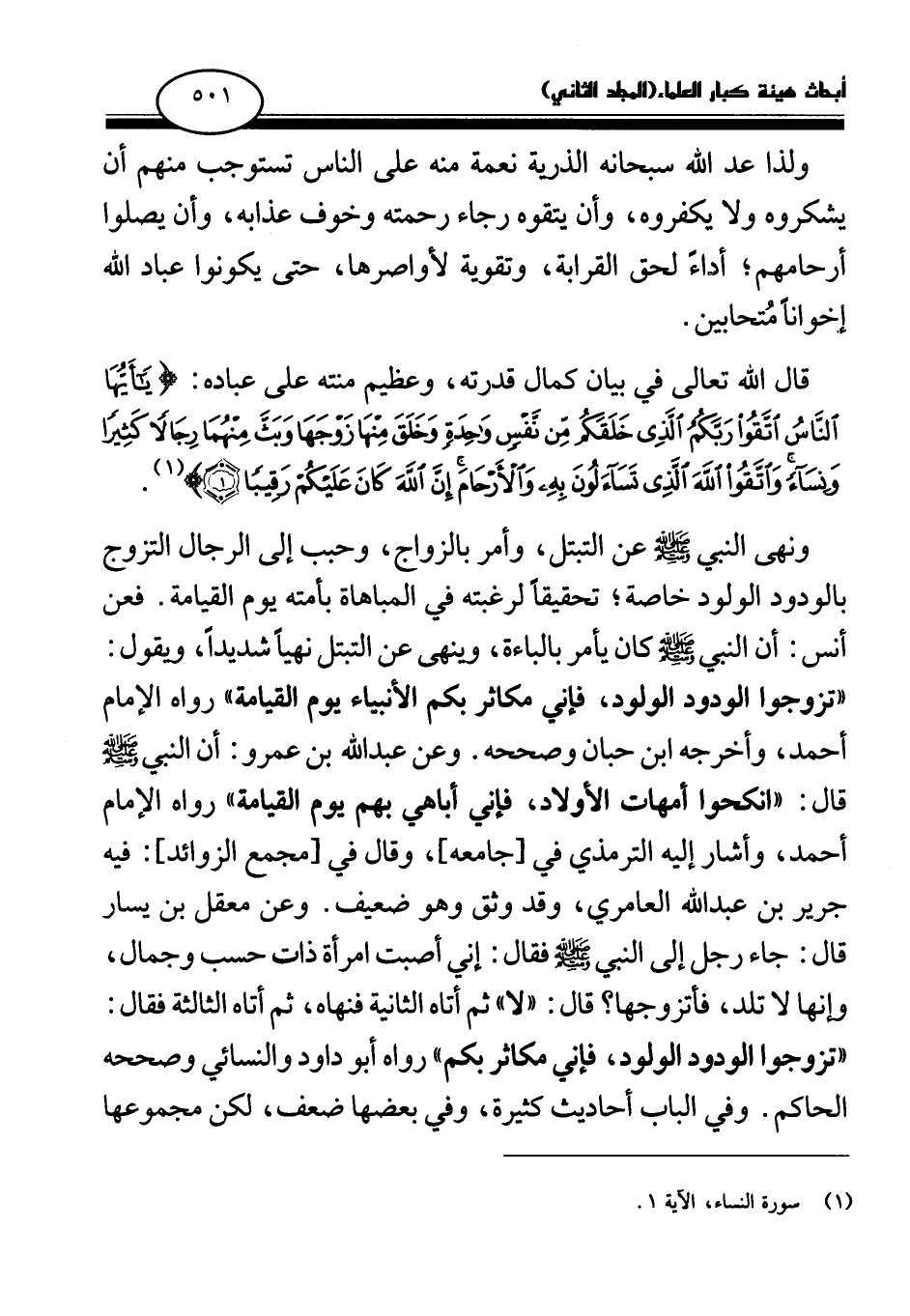 ونهى النبي - صلى الله عليه وسلم - عن التبتل، وأمر بالزواج، وحبب إلى الرجال التزوج بالودود الولود خاصة؛ تحقيقا لرغبته في المباهاة بأمته يوم القيامة. فعن أنس: أن النبي - صلى الله عليه وسلم - كان يأمر بالباءة، وينهى عن التبتل نهيا شديدا، ويقول: «تزوجوا الودود الولود، فإني مكاثر بكم الأنبياء يوم القيامة (¬2) » رواه الإمام أحمد، وأخرجه ابن حبان وصححه. وعن عبد الله بن عمرو: أن النبي - صلى الله عليه وسلم - قال: «انكحوا أمهات الأولاد، فإني أباهي بهم يوم القيامة (¬3) » رواه الإمام أحمد، وأشار إليه الترمذي في [جامعه] ، وقال في [مجمع الزوائد] : فيه جرير بن عبد الله العامري، وقد وثق وهو ضعيف. وعن معقل بن يسار قال: «جاء رجل إلى النبي - صلى الله عليه وسلم - فقال: إني أصبت امرأة ذات حسب وجمال، وإنها لا تلد، فأتزوجها؟ قال: " لا " ثم أتاه الثانية فنهاه، ثم أتاه الثالثة فقال: تزوجوا الودود الولود، فإني مكاثر بكم (¬4) » رواه أبو داود والنسائي وصححه الحاكم. وفي الباب أحاديث كثيرة، وفي بعضها ضعف، لكن مجموعها