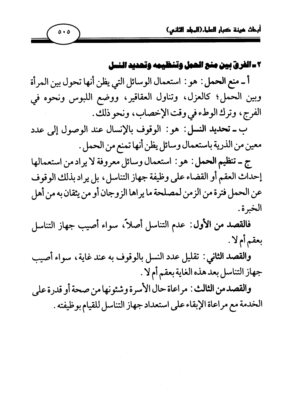 ب- تحديد النسل: هو الوقوف بالإنسال عند الوصول إلى عدد معين من الذرية باستعمال وسائل يظن أنها تمنع من الحمل.