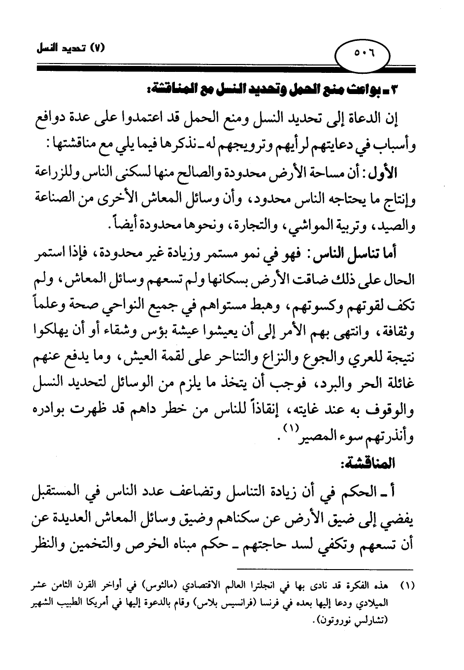 أ- الحكم في أن زيادة التناسل وتضاعف عدد الناس في المستقبل يفضي إلى ضيق الأرض عن سكناهم وضيق وسائل المعاش العديدة عن أن تسعهم وتكفي لسد حاجتهم - حكم مبناه الخرص والتخمين والنظر