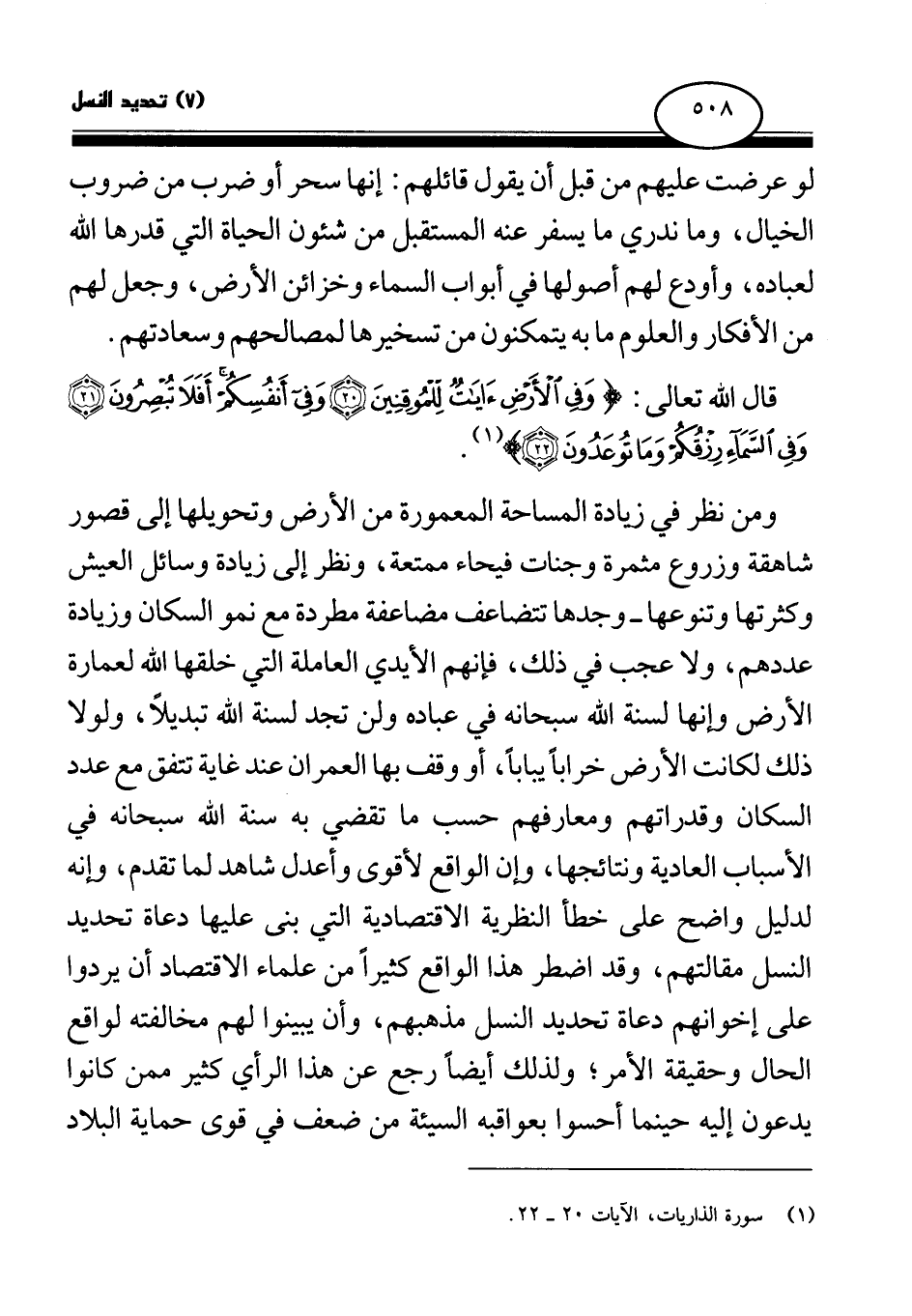 ومن نظر في زيادة المساحة المعمورة من الأرض وتحويلها إلى قصور شاهقة وزروع مثمرة وجنات فيحاء ممتعة، ونظر إلى زيادة وسائل العيش وكثرتها وتنوعها - وجدها تتضاعف مضاعفة مطردة مع نمو السكان وزيادة عددهم، ولا عجب في ذلك، فإنهم الأيدي العاملة التي خلقها الله لعمارة الأرض وإنها لسنة الله سبحانه في عباده ولن تجد لسنة الله تبديلا، ولولا ذلك لكانت الأرض خرابا يبابا، أو وقف بها العمران عند غاية تتفق مع عدد السكان وقدراتهم ومحارفهم حسبما تقضي به سنة الله سبحانه في الأسباب العادية ونتائجها، وإن الواقع لأقوى وأعدل شاهد لما تقدم، وإنه لدليل واضح على خطأ النظرية الاقتصادية التي بنى عليها دعاة تحديد النسل مقالتهم، وقد اضطر هذا الواقع كثيرا من علماء الاقتصاد أن يردوا على إخوانهم دعاة تحديد النسل مذهبهم، وأن يبينوا لهم مخالفته لواقع الحال وحقيقة الأمر؛ ولذلك أيضا رجع عن هذا الرأي كثير ممن كانوا يدعون إليه حينما أحسوا بعواقبه السيئة من ضعف في قوى حماية البلاد