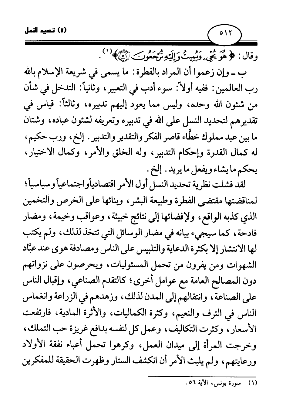 ب- وإن زعموا أن المراد بالفطرة: ما يسمى في شريعة الإسلام بالله رب العالمين: ففيه أولا: سوء أدب في التعبير، وثانيا: التدخل في شأن من شئون الله وحده، وليس مما يعود إليهم تدبيره، وثالثا: قياس في تقديرهم لتحديد النسل على الله في تدبيره وتعريفه لشئون عباده، وشتان ما بين عبد مملوك خطاء قاصر الفكر والتقدير والتدبير. إلخ، ورب حكيم، له كمال القدرة وإحكام التدبير، وله الخلق والأمر، وكمال الاختيار، يحكم ما يشاء ويفعل ما يريد. إلخ.