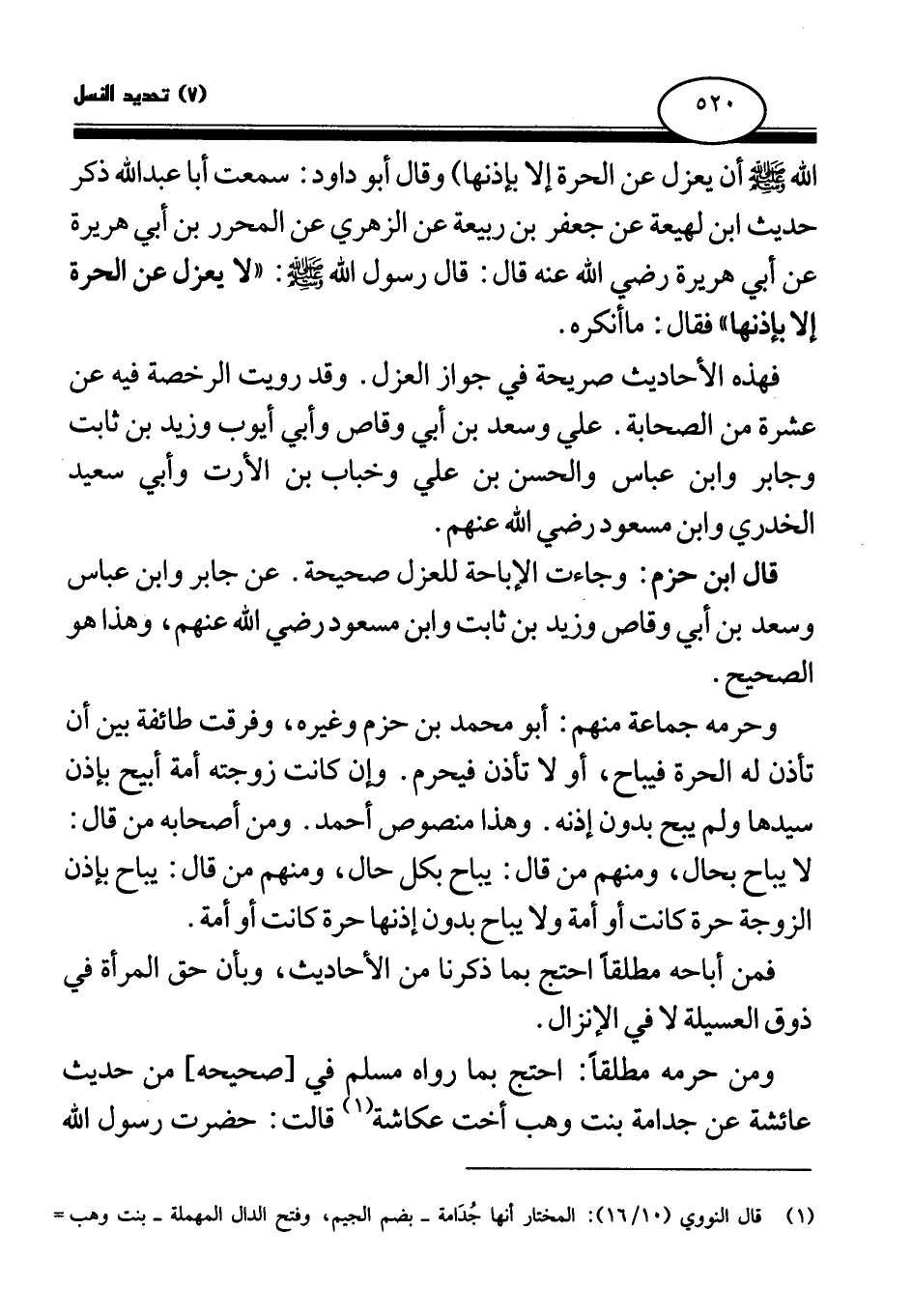 قال ابن حزم: وجاءت الإباحة للعزل صحيحة. عن جابر وابن عباس وسعد بن أبي وقاص وزيد بن ثابت وابن مسعود رضي الله عنهم، وهذا هو الصحيح.