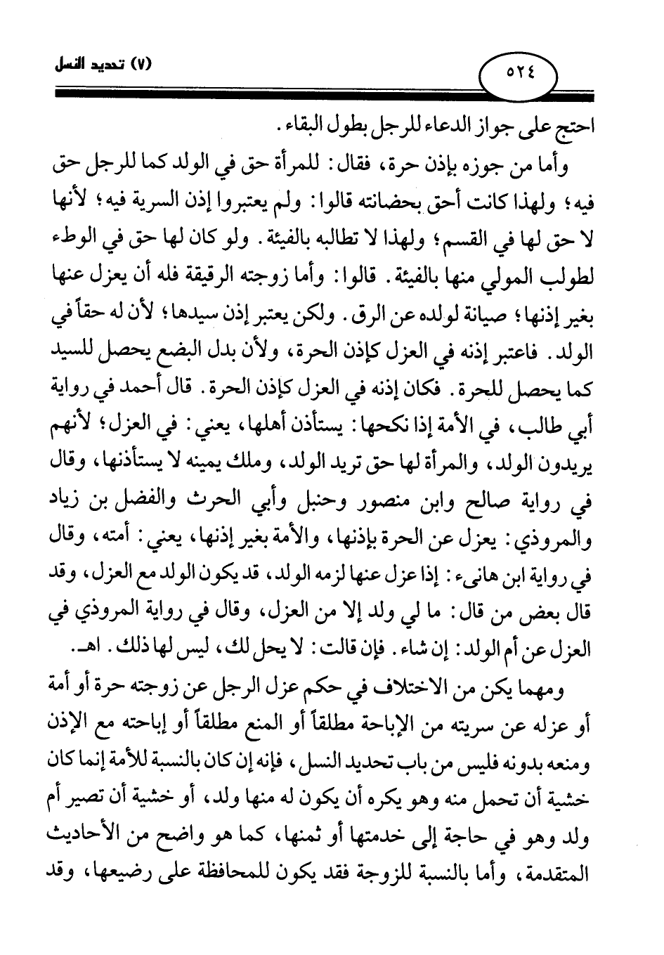وأما من جوزه بإذن حرة، فقال: للمرأة حق في الولد كما للرجل حق فيه؛ ولهذا كانت أحق بحضانته، قالوا: ولم يعتبروا إذن السرية فيه؛ لأنها لا حق لها في القسم؛ ولهذا لا تطالبه بالفيئة. ولو كان لها حق في الوطء لطولب المولي منها بالفيئة. قالوا: وأما زوجته الرقيقة فله أن يعزل عنها بغير إذنها؛ صيانة لولده عن الرق. ولكن يعتبر إذن سيدها؛ لأن له حقا في الولد. فاعتبر إذنه في العزل كإذن الحرة، ولأن بدل البضع يحصل للسيد كما يحصل للحرة. فكان إذنه في العزل كإذن الحرة. قال أحمد في رواية أبي طالب، في الأمة إذا نكحها: يستأذن أهلها، يعني: في العزل؛ لأنهم يريدون الولد، والمرأة لها حق تريد الولد، وملك يمينه لا يستأذنها، وقال في رواية صالح وابن منصور وحنبل وأبي الحرث والفضل بن زياد والمروذي: يعزل عن الحرة بإذنها، والأمة بغير إذنها، يعني: أمته، وقال في رواية ابن هانئ: إذا عزل عنها لزمه الولد، قد يكون الولد مع العزل، وقد قال بعض من قال: ما لي ولد إلا من العزل، وقال في رواية المروذي في العزل عن أم الولد: إن شاء. فإن قالت: لا يحل لك، ليس لها ذلك. اهـ.