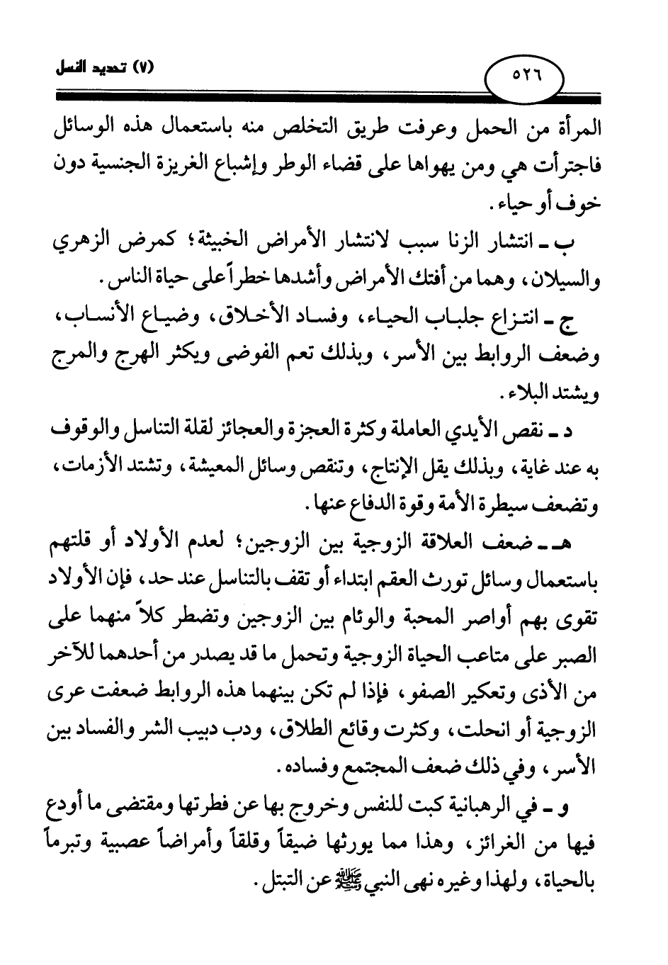 هـ- ضعف العلاقة الزوجية بين الزوجين؛ لعدم الأولاد أو قلتهم باستعمال وسائل تورث العقم ابتداء أو تقف بالتناسل عند حد، فإن الأولاد تقوى بهم أواصر المحبة والوئام بين الزوجين وتضطر كلا منهما على الصبر على متاعب الحياة الزوجية وتحمل ما قد يصدر من أحدهما للآخر من الأذى وتعكير الصفو، فإذا لم تكن بينهما هذه الروابط ضعفت عرى الزوجية أو انحلت، وكثرت وقائع الطلاق، ودب دبيب الشر والفساد بين الأسر، وفي ذلك ضعف المجتمع وفساده.