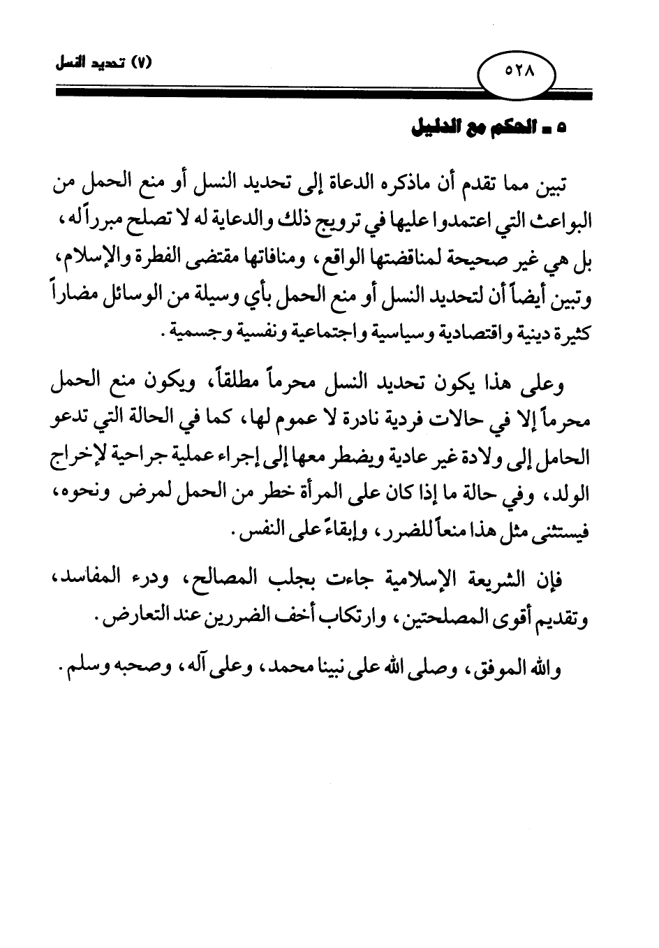 وعلى هذا يكون تحديد النسل محرما مطلقا، ويكون منع الحمل محرما إلا في حالات فردية نادرة لا عموم لها، كما في الحالة التي تدعو الحامل إلى ولادة غير عادية ويضطر معها إلى إجراء عملية جراحية لإخراج الولد، وفي حالة ما إذا كان على المرأة خطر من الحمل لمرض ونحوه، فيستثنى مثل هذا منعا للضرر، وإبقاء على النفس.