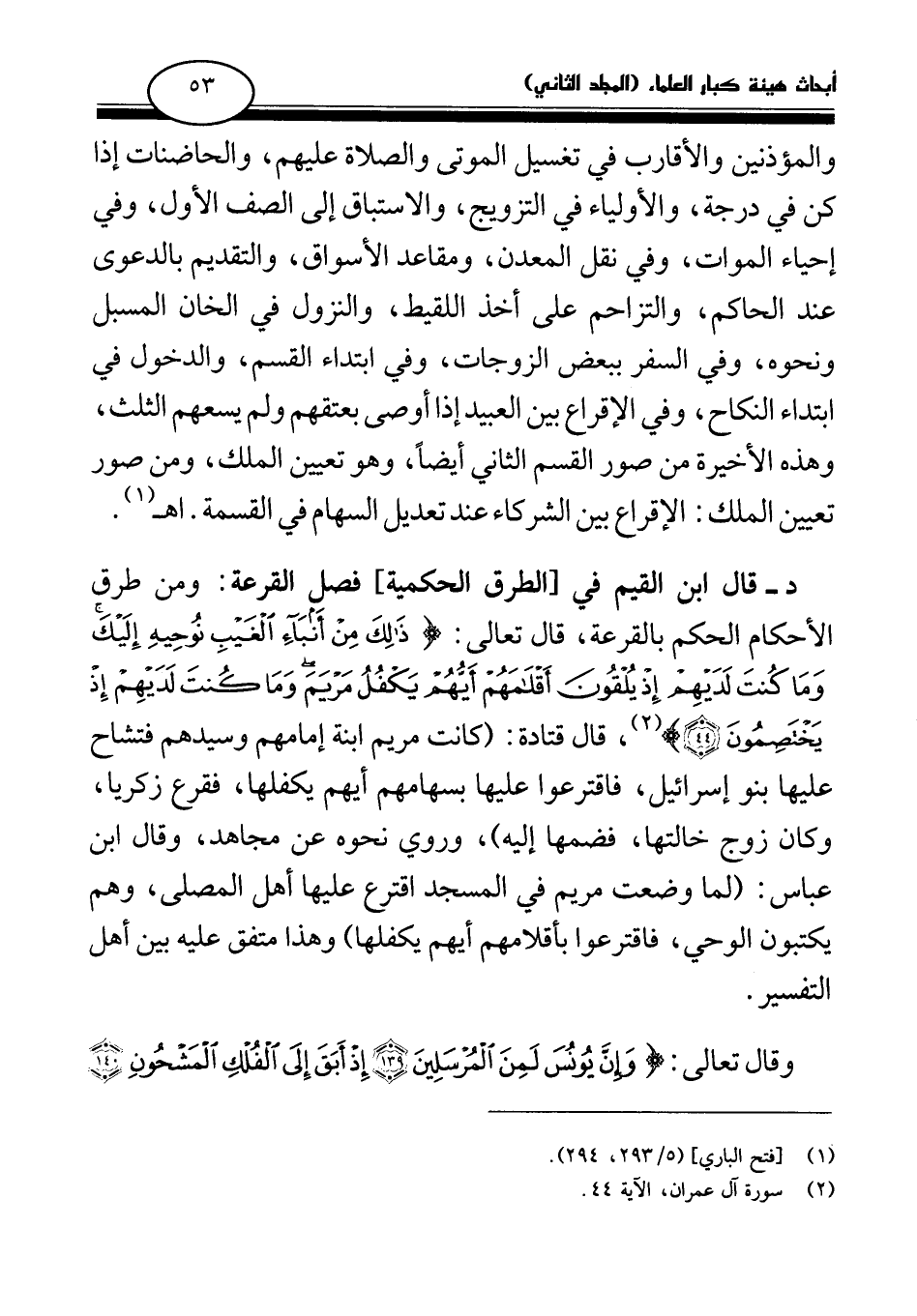 د - قال ابن القيم في [الطرق الحكمية] فصل القرعة: ومن طرق الأحكام الحكم بالقرعة، قال تعالى: {ذَلِكَ مِنْ أَنْبَاءِ الْغَيْبِ نُوحِيهِ إِلَيْكَ وَمَا كُنْتَ لَدَيْهِمْ إِذْ يُلْقُونَ أَقْلَامَهُمْ أَيُّهُمْ يَكْفُلُ مَرْيَمَ وَمَا كُنْتَ لَدَيْهِمْ إِذْ يَخْتَصِمُونَ} (¬2) قال قتادة: (كانت مريم ابنة إمامهم وسيدهم فتشاح عليها بنو إسرائيل، فاقترعوا عليها بسهامهم أيهم يكفلها، فقرع زكريا، وكان زوج خالتها، فضمها إليه) ، وروي نحوه عن مجاهد، وقال ابن عباس: (لما وضعت مريم في المسجد اقترع عليها أهل المصلى، وهم يكتبون الوحي، فاقترعوا بأقلامهم أيهم يكفلها) وهذا متفق عليه بين أهل التفسير.