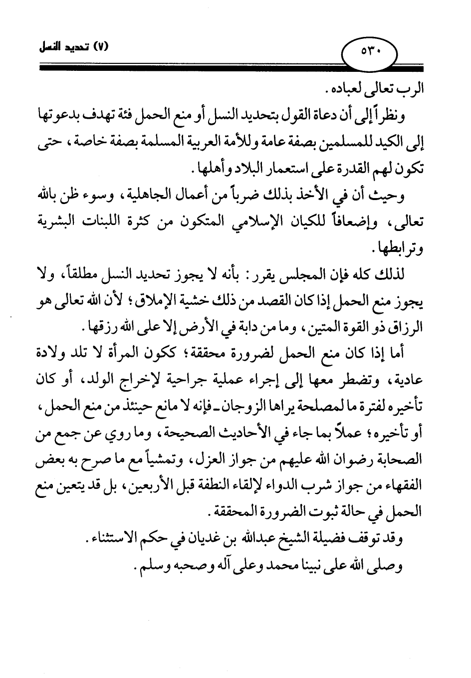 لذلك كله فإن المجلس يقرر: بأنه لا يجوز تحديد النسل مطلقا، ولا يجوز منع الحمل إذا كان القصد من ذلك خشية الإملاق؛ لأن الله تعالى هو الرزاق ذو القوة المتين، وما من دابة في الأرض إلا على الله رزقها.