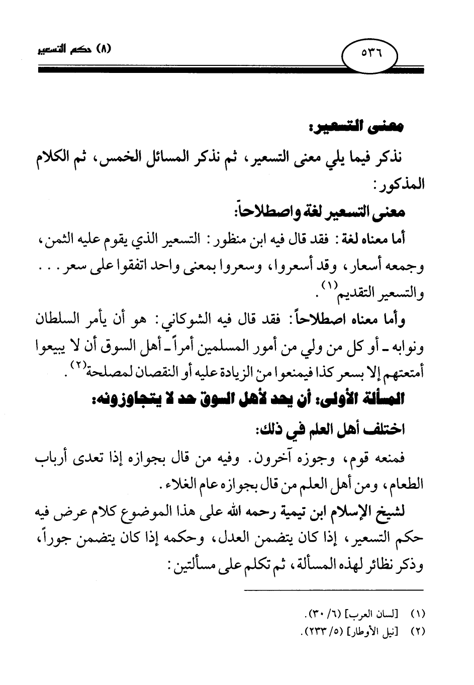 وأما معناه اصطلاحا: فقد قال فيه الشوكاني: هو أن يأمر السلطان ونوابه- أو كل من ولي من أمور المسلمين أمرا- أهل السوق أن لا يبيعوا أمتعتهم إلا بسعر كذا فيمنعوا من الزيادة عليه أو النقصان لمصلحة (¬2) .