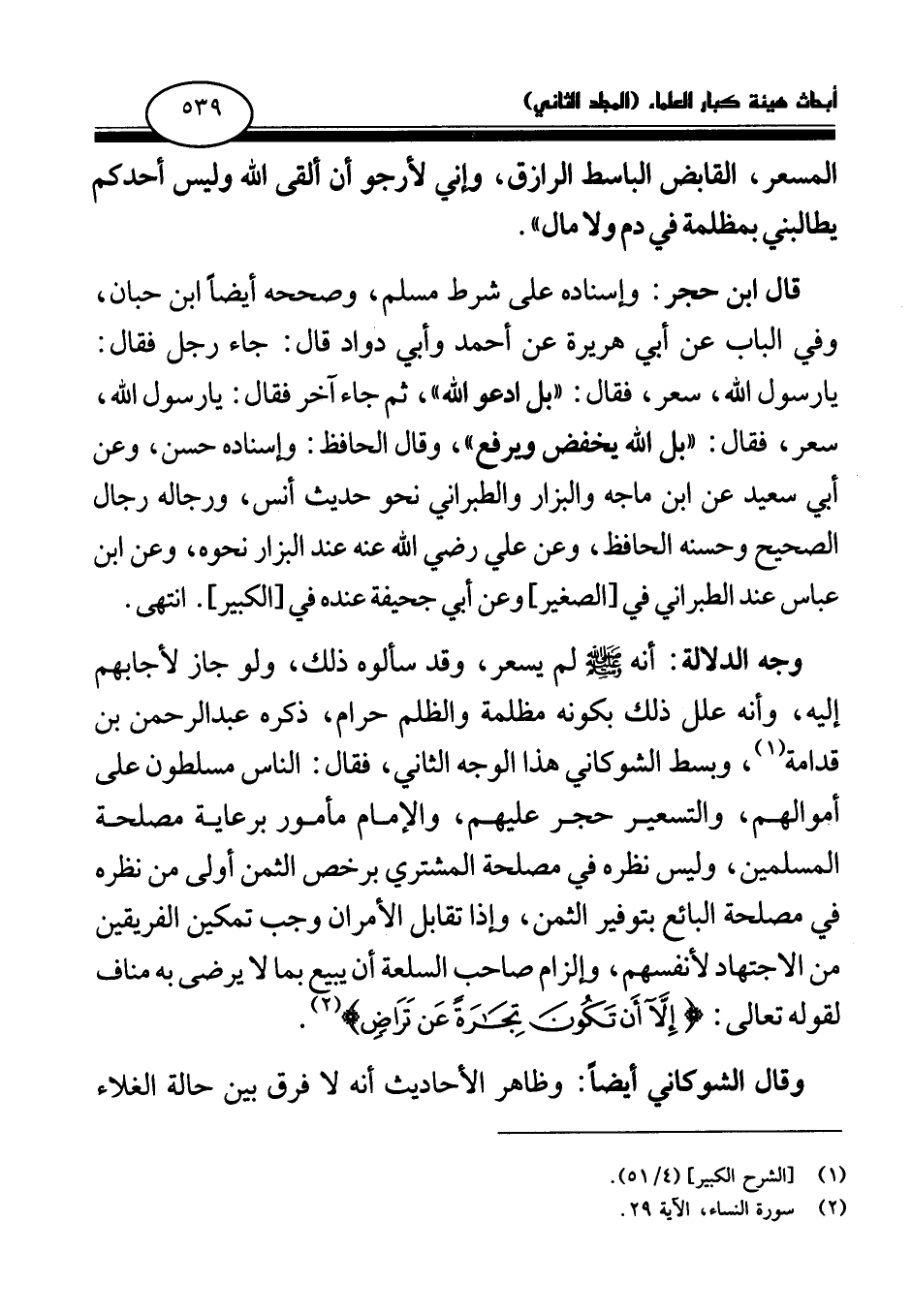 وجه الدلالة: أنه صلى الله عليه وسلم لم يسعر، وقد سألوه ذلك، ولو جاز لأجابهم إليه، وأنه علل ذلك بكونه مظلمة والظلم حرام، ذكره عبد الرحمن بن قدامة (¬3) ، وبسط الشوكاني هذا الوجه الثاني، فقال: الناس مسلطون على أموالهم، والتسعير حجر عليهم، والإمام مأمور برعاية مصلحة المسلمين، وليس نظره في مصلحة المشتري برخص الثمن أولى من نظره في مصلحة البائع بتوفير الثمن، وإذا تقابل الأمران وجب تمكين الفريقين من الاجتهاد لأنفسهم، وإلزام صاحب السلعة أن يبيع بما لا يرضى به مناف؛ لقوله تعالى: {إِلَّا أَنْ تَكُونَ تِجَارَةً عَنْ تَرَاضٍ} (¬4)