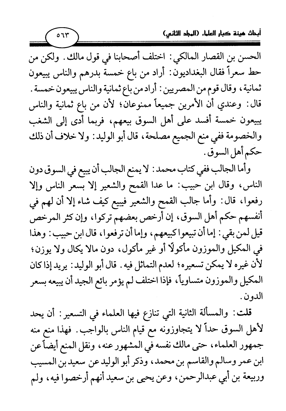 قلت: والمسألة الثانية التي تنازع فيها العلماء في التسعير: أن يحد لأهل السوق حدا لا يتجاوزونه مع قيام الناس بالواجب فهذا منع منه جمهور العلماء. حتى مالك نفسه في المشهور عنه، ونقل المنع أيضا عن ابن عمر ولسالم والقاسم بن محمد، وذكر أبو الوليد عن سعيد بن المسيب وربيعة بن أبي عبد الرحمن، وعن يحيى بن سعيد أنهم أرخصوا فيه، ولم