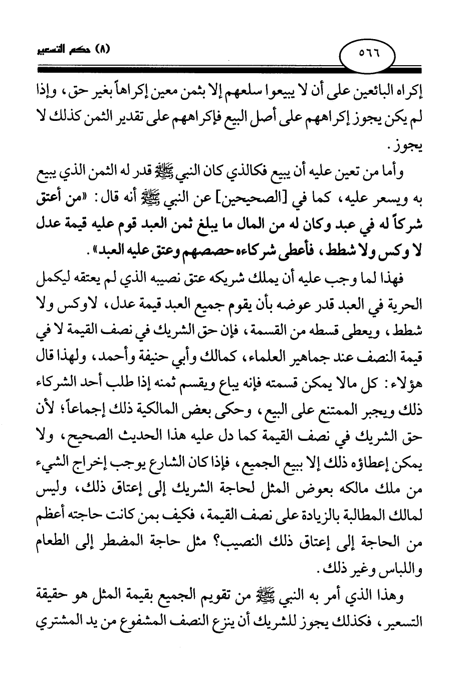 وأما من تعين عليه أن يبيع فكالذي كان النبي صلى الله عليه وسلم قدر له الثمن الذي يبيع به وشعر عليه، كما في [الصحيحين] ، عن النبي صلى الله عليه وسلم أنه قال: «من أعتق شركا له في عبد وكان له من المال ما يبلغ ثمن العبد قوم عليه قيمة عدل لا وكس ولا شطط، فأعطى شركاءه - حصصهم وعتق عليه العبد (¬1) » . فهذا لما وجب عليه أن يملك شريكه عتق نصيبه الذي لم يعتقه ليكمل الحرية في العبد قدر عوضه بأن يقوم جميع العبد قيمة عدل، لا وكس ولا شطط، ويعطى قسطه من القسمة، فإن حق الشريك في نصف القيمة لا في قيمة النصف عند جماهير العلماء، كمالك وأبي حنيفة وأحمد، ولهذا قال هؤلاء: كل ما لا يمكن قسمته فإنه يباع ويقسم ثمنه إذا طلب أحد الشركاء ذلك ويجبر الممتنع على البيع، وحكى بعض المالكية ذلك إجماعا؛ لأن حق الشريك في نصف القيمة كما دل عليه هذا الحديث الصحيح، ولا يمكن إعطاؤه ذلك إلا ببيع الجميع، فإذا كان الشارع يوجب إخراج الشيء من ملك مالكه بعوض المثل لحاجة الشريك إلى إعتاق ذلك، وليس لمالك المطالبة بالزيادة على نصف القيمة، فكيف بمن كانت حاجته أعظم من الحاجة إلى إعتاق ذلك النصيب؟ مثل حاجة المضطر إلى الطعام واللباس وغير ذلك.