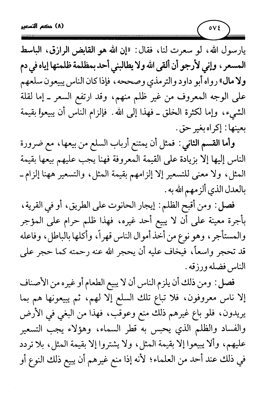 يا رسول الله، لو سعرت لنا، فقال: إن الله هو القابض الرازق، الباسط المسعر، وإني لأرجو أن ألقى الله ولا يطالبني أحد بمظلمة ظلمتها إياه في دم ولا مال (¬1) » رواه أبو داود والترمذي وصححه، فإذا كان الناس يبيعون سلعهم على الوجه المعروف من غير ظلم منهم، وقد ارتفع السعر - إما لقلة الشيء وإما لكثرة الخلق - فهذا إلى الله. فإلزام الناس أن يبيعوا بقيمة بعينها: إكراه بغير حق.