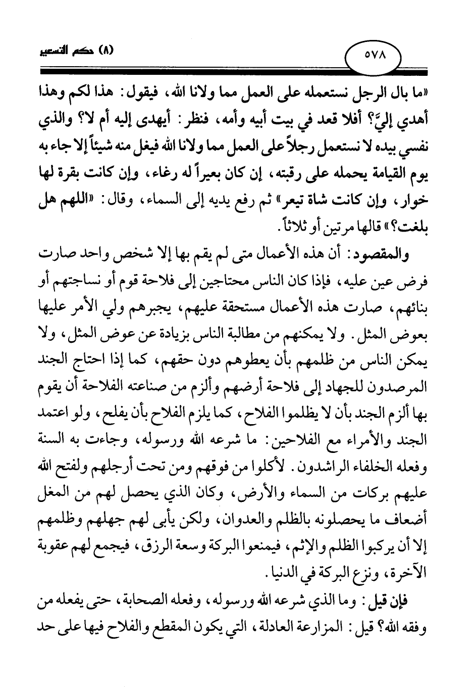 والمقصود: أن هذه الأعمال متى لم يقم بها إلا شخص واحد صارت فرض عين عليه، فإذا كان الناس محتاجين إلى فلاحة قوم أو نساجتهم أو بنائهم، صارت هذه الأعمال مستحقة عليهم، يجبرهم ولي الأمر عليها بعوض المثل. ولا يمكنهم من مطالبة الناس بزيادة عن عوض المثل، ولا يمكن الناس من ظلمهم بأن يعطوهم دون حقهم، كما إذا احتاج الجند المرصدون للجهاد إلى فلاحة أرضهم وألزم من صناعته الفلاحة أن يقوم بها ألزم الجند بأن لا يظلموا الفلاح، كما يلزم الفلاح بأن يفلح، ولو اعتمد الجند والأمراء مع الفلاحين: ما شرعه الله ورسوله، وجاءت به السنة وفعله الخلفاء الراشدون، لأكلوا من فوقهم ومن تحت أرجلهم ولفتح الله عليهم بركات من السماء والأرض، وكان الذي يحصل لهم من المغل أضعاف ما يحصلونه بالظلم والعدوان، ولكن يأبى لهم جهلهم وظلمهم إلا أن يركبوا الظلم والإثم، فيمنعوا البركة وسعة الرزق، فيجمع لهم عقوبة الآخرة، ونزع البركة في الدنيا.
