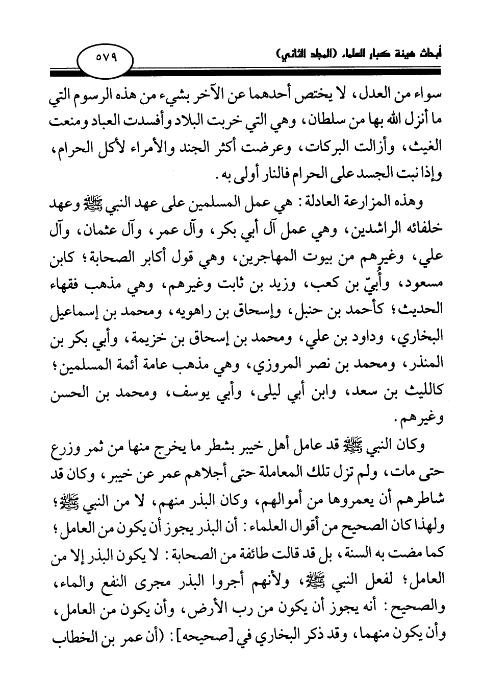 وهذه المزارعة العادلة: هي عمل المسلمين على عهد النبي صلى الله عليه وسلم وعهد خلفائه الراشدين، وهي عمل آل أبي بكر، وآل عمر، وآل عثمان، وآل علي، وغيرهم من بيوت المهاجرين، وهي قول أكابر الصحابة، كابن مسعود، وأبي بن كعب، وزيد بن ثابت وغيرهم، وهي مذهب فقهاء الحديث؛ كأحمد بن حنبل، وإسحاق بن راهويه، ومحمد بن إسماعيل البخاري، وداود بن علي، ومحمد بن إسحاق بن خزيمة، وأبي بكر بن المنذر، ومحمد بن نصر المروزي، وهي مذهب عامة أئمة المسلمين؛ كالليث بن سعد، وابن أبي ليلى، وأبي يوسف، ومحمد بن الحسن وغيرهم.