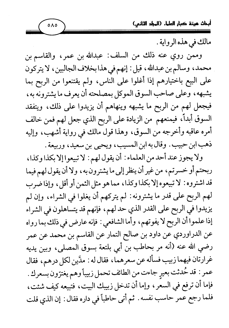 وممن روي عنه ذلك من السلف: عبد الله بن عمر، والقاسم بن محمد، وسالم بن عبد الله، قيل: إنهم في هذا بخلاف الجالبين، لا يتركون على البيع باختيارهم إذا أغلوا على الناس، ولم يقتنعوا من الربح بما يشبهه، وعلى صاحب السوق الموكل بمصلحته أن يعرف ما يشترونه به، فيجعل لهم من الربح ما يشبهه وينهاهم أن يزيدوا على ذلك، ويتفقد السوق أبدا، فيمنعهم من الزيادة على الربح الذي جعل لهم فمن خالف أمره عاقبه وأخرجه من السوق، وهذا قول مالك في رواية أشهب، وإليه ذهب ابن حبيب. وقال به ابن المسيب، ويحيى بن سعيد، وربيعة.