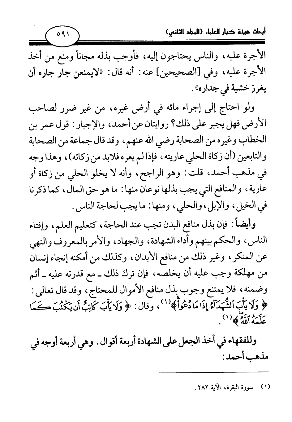 ولو احتاج إلى إجراء مائه في أرض غيره، من غير ضرر لصاحب الأرض فهل يجبر على ذلك؟ روايتان عن أحمد، والإجبار: قول عمر بن الخطاب وغيره من الصحابة رضي الله عنهم، وقد قال جماعة من الصحابة والتابعين (أن زكاة الحلي عاريته، فإذا لم يعره فلا بد من زكاته) ، وهذا وجه في مذهب أحمد، قلت: وهو الراجح، وأنه لا يخلو الحلي من زكاة أو عارية، والمنافع التي يجب بذلها نوعان منها: ما هو حق المال، كما ذكرنا في الخيل، والإبل، والحلي، ومنها: ما يجب لحاجة الناس.