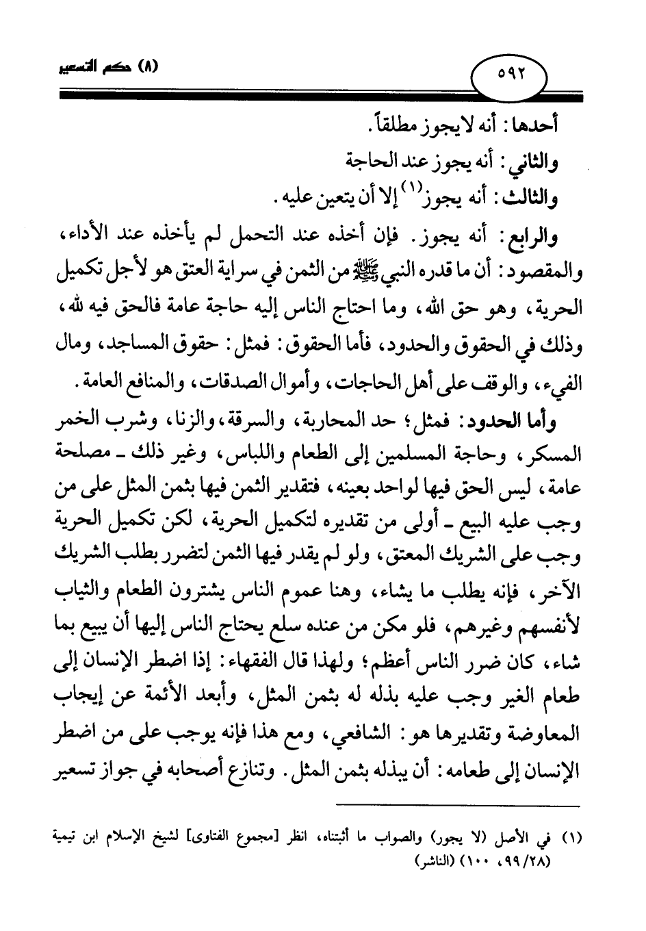 والرابع: أنه يجوز. فإن أخذه عند التحمل لم يأخذه عند الأداء، والمقصود: أن ما قدره النبي صلى الله عليه وسلم من الثمن في سراية العتق هو لأجل تكميل الحرية، وهو حق الله، وما احتاج الناس إليه حاجة عامة فالحق فيه لله، وذلك في الحقوق والحدود، فأما الحقوق: فمثل: حقوق المساجد، ومال الفيء، والوقف على أهل الحاجات، وأموال الصدقات، والمنافع العامة. وأما الحدود: فمثل، حد المحاربة، والسرقة، والزنا، وشرب الخمر المسكر، وحاجة المسلمين إلى الطعام واللباس، وغير ذلك- مصلحة عامة، ليس الحق فيها لواحد بعينه، فتقدير الثمن فيها بثمن المثل على من وجب عليه البيع أولى من تقديره لتكميل الحرية، لكن تكميل الحرية وجب على الشريك المعتق، ولو لم يقدر فيها الثمن لتضرر بطلب الشريك الآخر، فإنه يطلب ما يشاء، وهنا عموم الناس يشترون الطعام والثياب لأنفسهم وغيرهم، فلو مكن من عنده سلع يحتاج الناس إليها أن يبيع بما شاء، كان ضرر الناس أعظم؛ ولهذا قال الفقهاء: إذا اضطر الإنسان إلى طعام الغير وجب عليه بذله له بثمن المثل، وأبعد الأئمة عن إيجاب المعاوضة وتقديرها هو: الشافعي، ومع هذا فإنه يوجب على من اضطر الإنسان إلى طعامه: أن يبذله بثمن المثل. وتنازع أصحابه في جواز تسعير