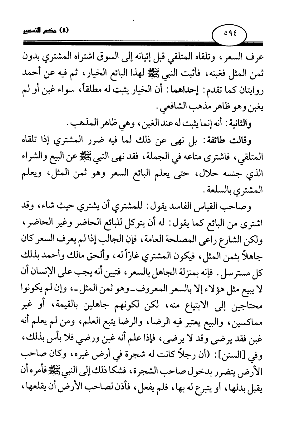 عرف السعر، وتلقاه المتلقي قبل إتيانه إلى السوق اشتراه المشتري بدون ثمن المثل فغبنه، فأثبت النبي صلى الله عليه وسلم لهذا البائع الخيار، ثم فيه عن أحمد روايتان كما تقدم: إحداهما: أن الخيار يثبت له مطلقا، سواء غبن أو لم يغبن وهو ظاهر مذهب الشافعي.