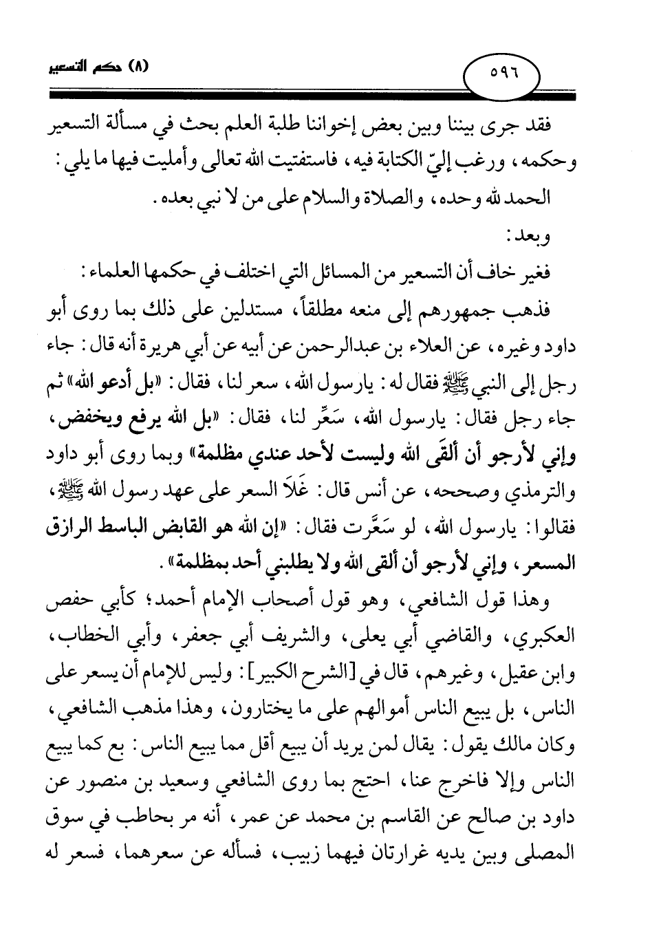 فقد جرى بيننا وبين بعض إخواننا طلبة العلم بحث في مسألة التسعير وحكمه، ورغب إلي الكتابة فيه، فاستفتيت الله تعالى وأمليت فيها ما يلي: الحمد لله وحده، والصلاة والسلام على من لا نبي بعده.
