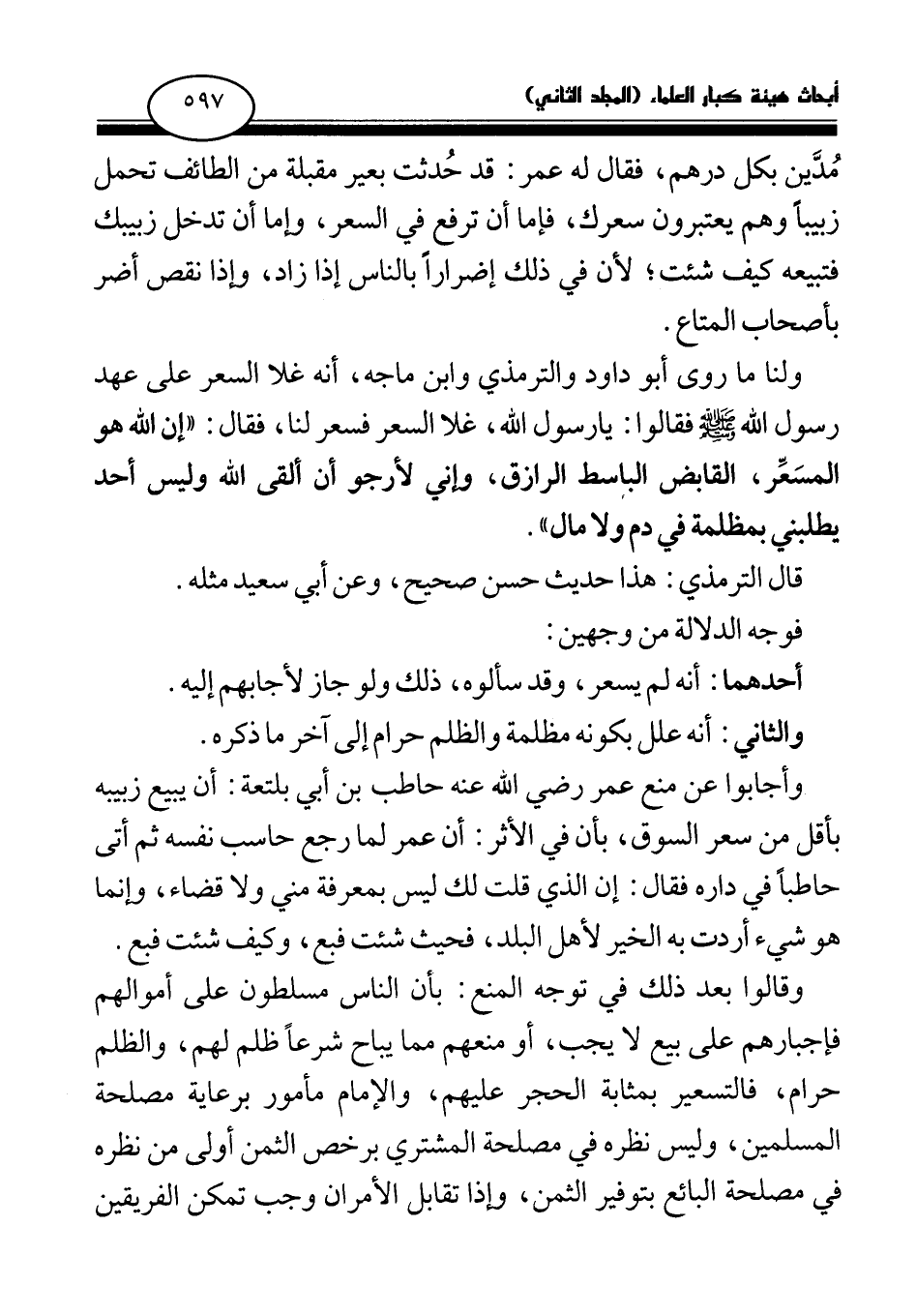 مدين بكل درهم، فقال له عمر: قد حدثت بعير مقبلة من الطائف تحمل زبيبا وهم يعتبرون سعرك، فإما أن ترفع في السعر، وإما أن تدخل زبيبك فتبيعه كيف شئت؛ لأن في ذلك إضرارا بالناس إذا زاد، وإذا نقص أضر بأصحاب المتاع.