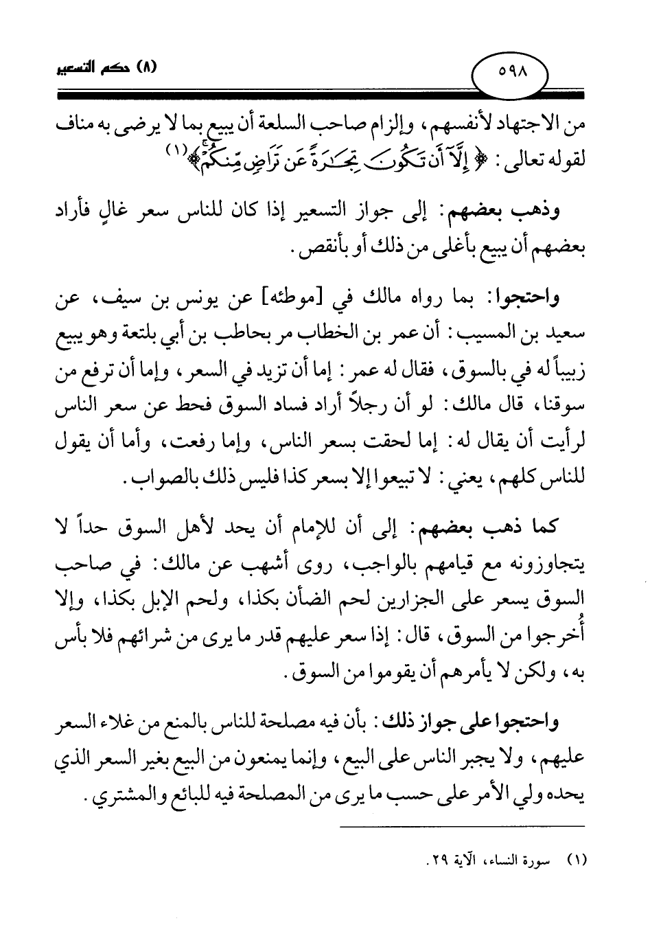 من الاجتهاد لأنفسهم، وإلزام صاحب السلعة أن يبيع بما لا يرضى به مناف لقوله تعالى: {إِلَّا أَنْ تَكُونَ تِجَارَةً عَنْ تَرَاضٍ مِنْكُمْ} (¬1) وذهب بعضهم: إلى جواز التسعير إذا كان للناس سعر غال فأراد بعضهم أن يبيع بأغلى من ذلك أو بأنقص.