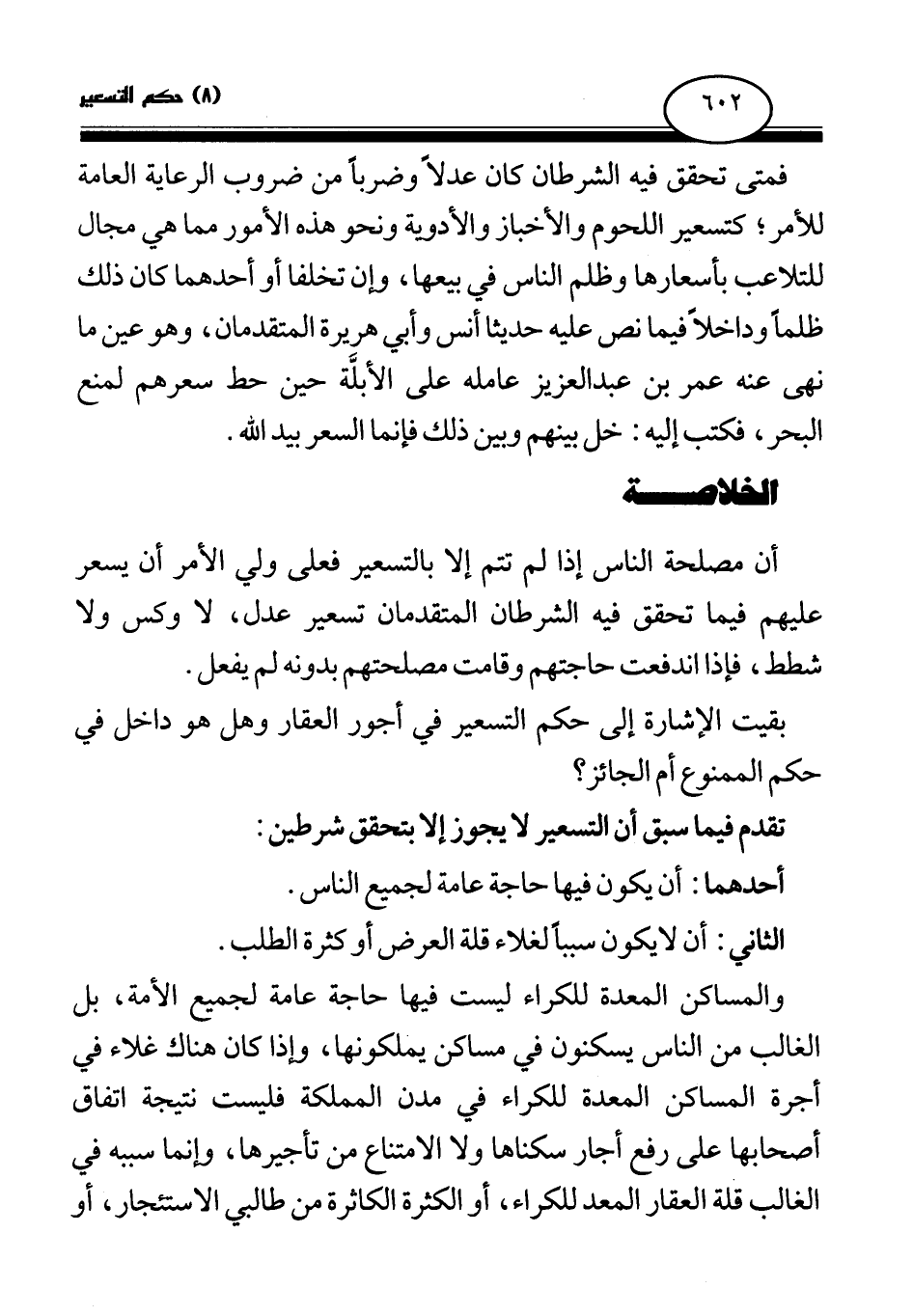 فمتى تحقق فيه الشرطان كان عدلا وضربا من ضروب الرعاية العامة للأمر؛ كتسعير اللحوم والأخباز والأدوية ونحو هذه الأمور مما هي مجال للتلاعب بأسعارها وظلم الناس في بيعها، وإن تخلفا أو أحدهما كان ذلك ظلما وداخلا فيما نص عليه حديثا أنس وأبي هريرة المتقدمان، وهو عين ما نهى عنه عمر بن عبد العزيز عامله على الأبلة حين حط سعرهم لمنع البحر، فكتب إليه: خل بينهم وبين ذلك فإنما السعر بيد الله.